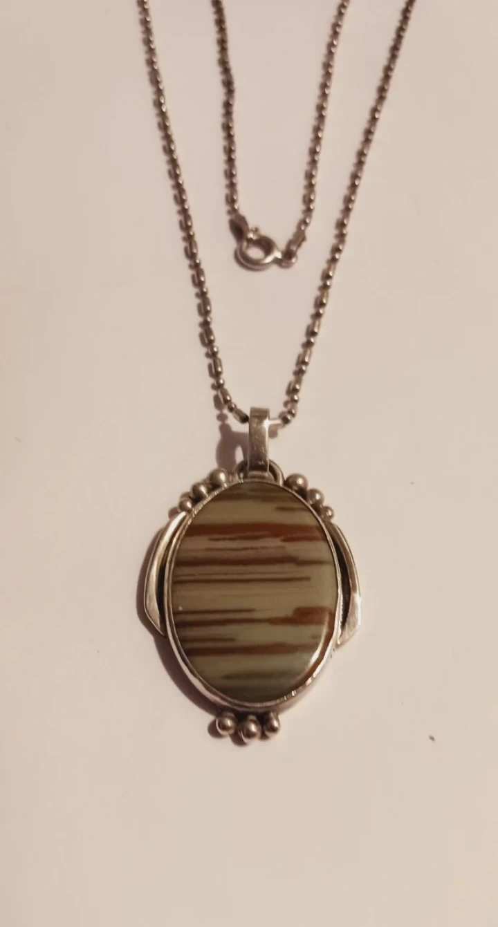 LIZ HORN & RON ZUKOR ," LIZ RON 925" DESIGNERS SIGNED MODERNIST STERLING SILVER 925 GENUINE JASPER STONE PENDANT WITH STERLING SILVER 925 NECKLACE.Oval stone pendant on a sterling