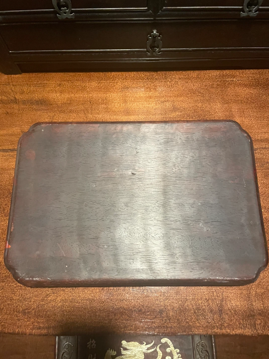 Decorative wooden tray featuring inlaid designs of koi fish, lotus flowers, and cloud motifs. It's made of dark wood with intricate shell or mother-of-pearl accents. This piece could serve as a unique display item or for serving small items.