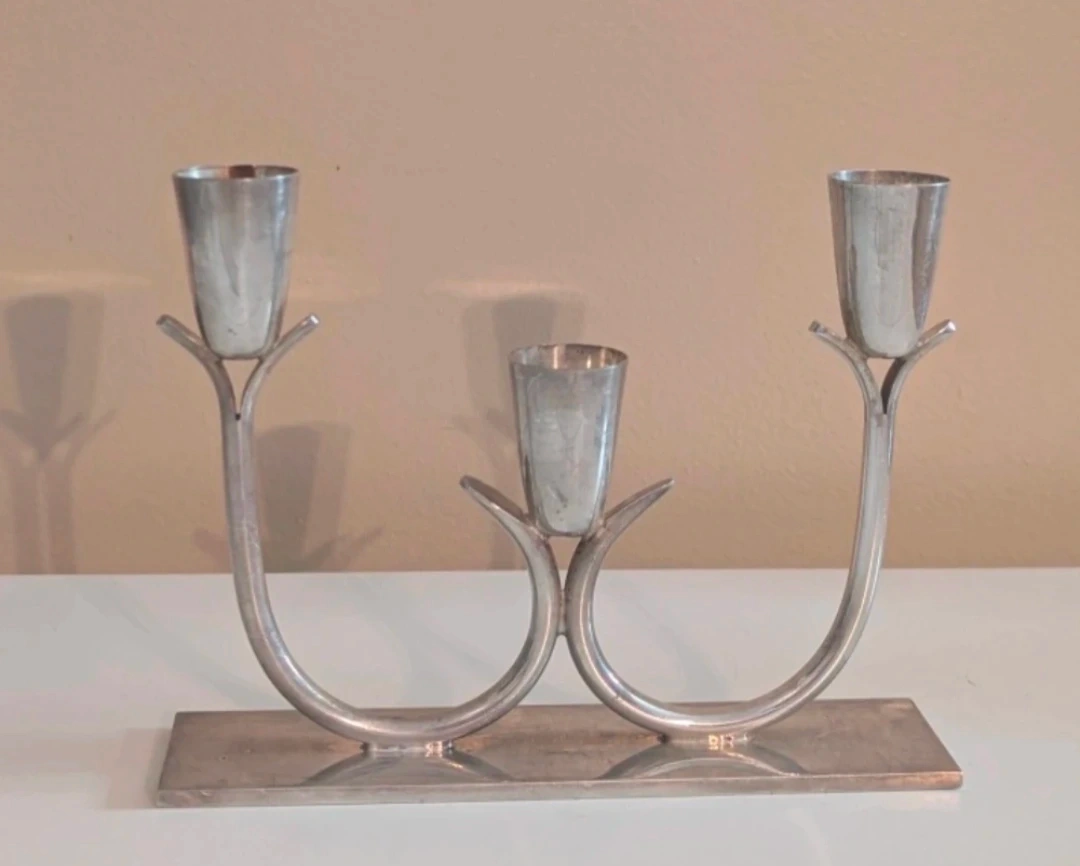 This is a three-arm candle holder. It's made of a silver-tone metal and has a sleek, modern design. Perfect for adding ambiance to any room!