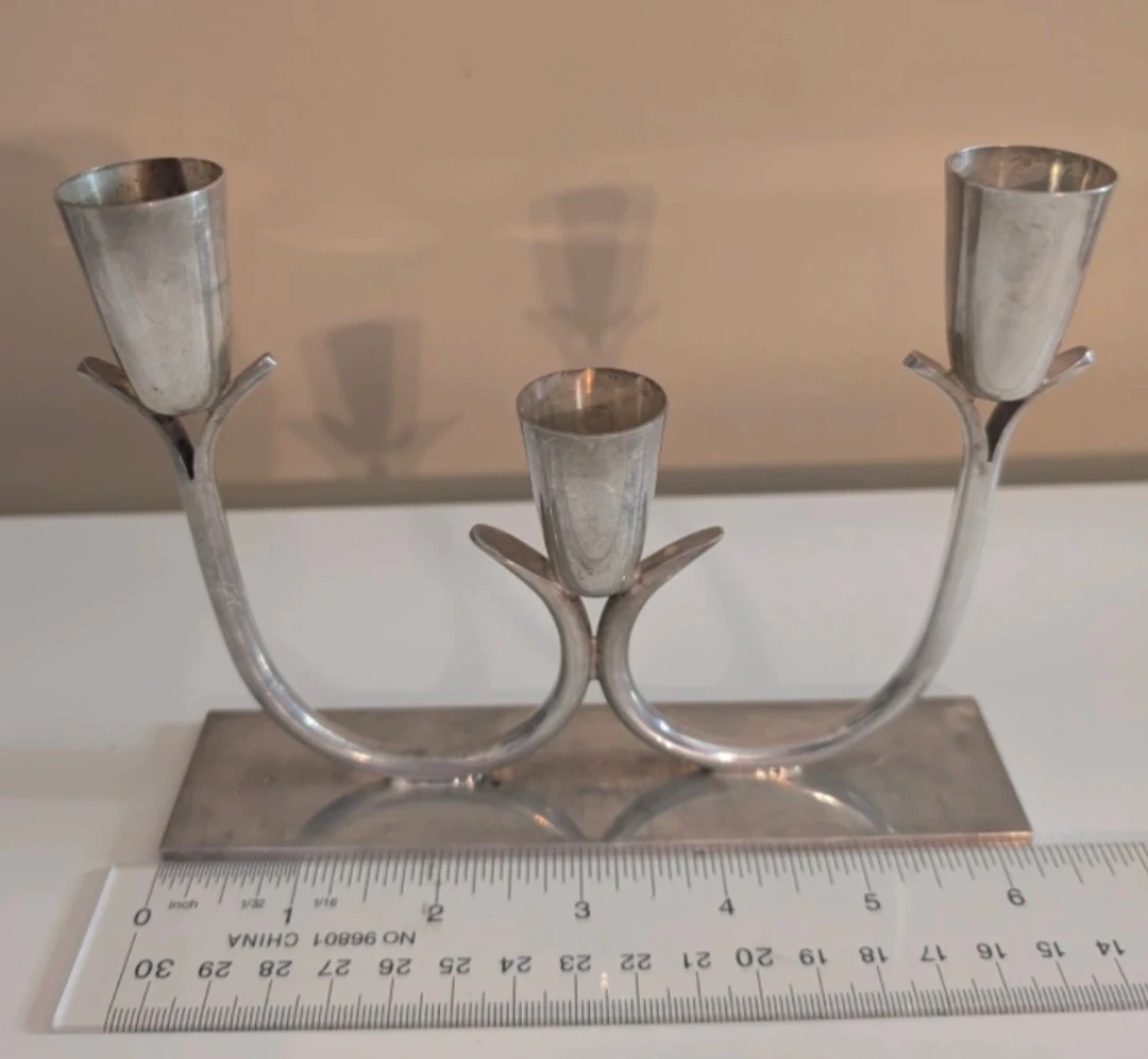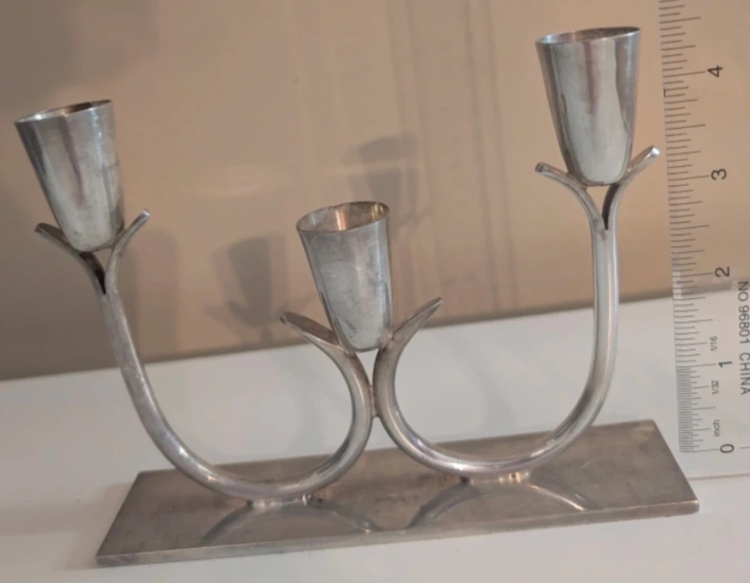 This is a three-arm candle holder. It's made of a silver-tone metal and has a sleek, modern design. Perfect for adding ambiance to any room!