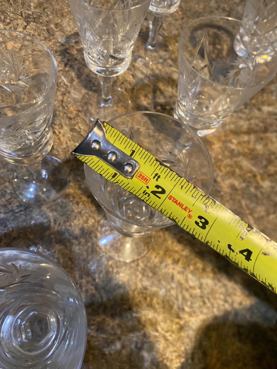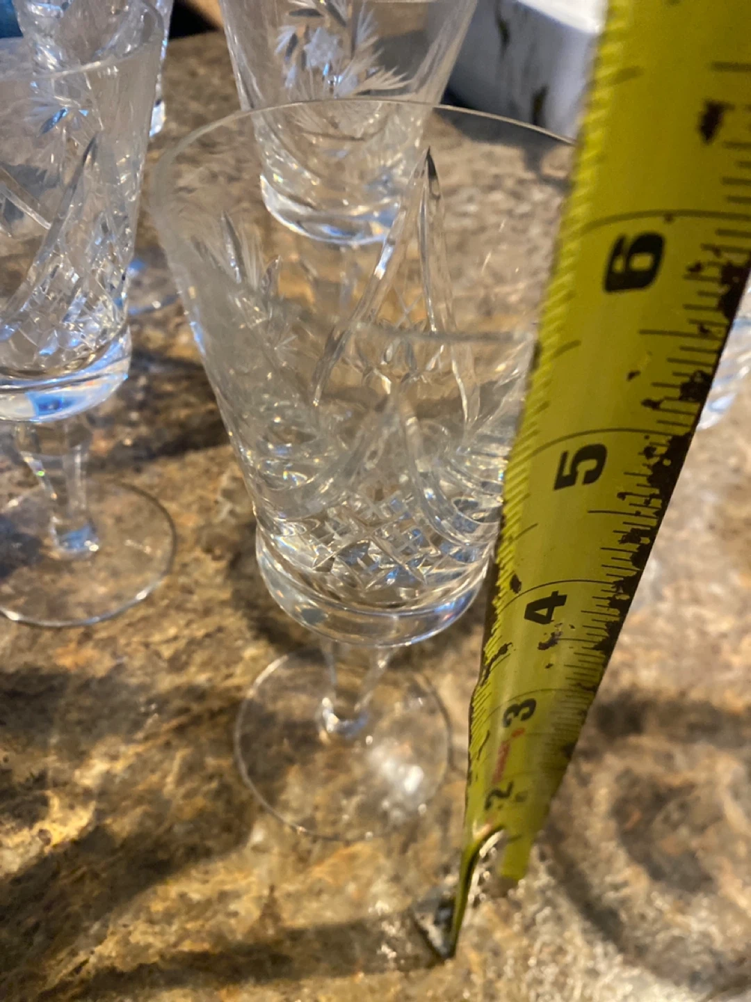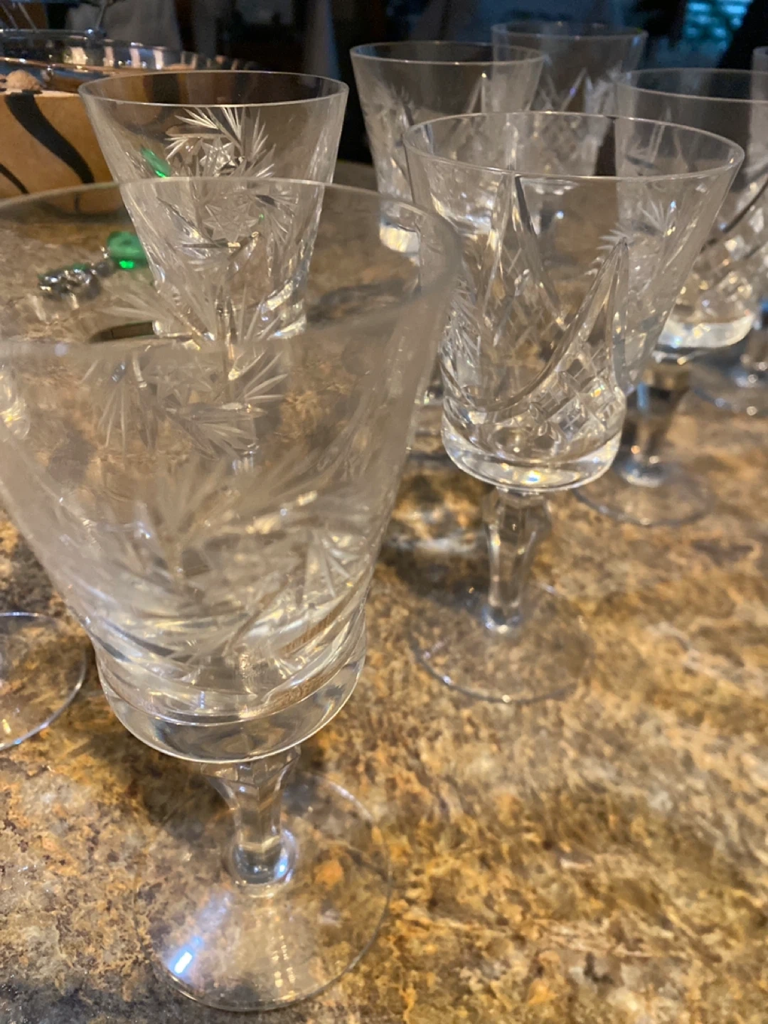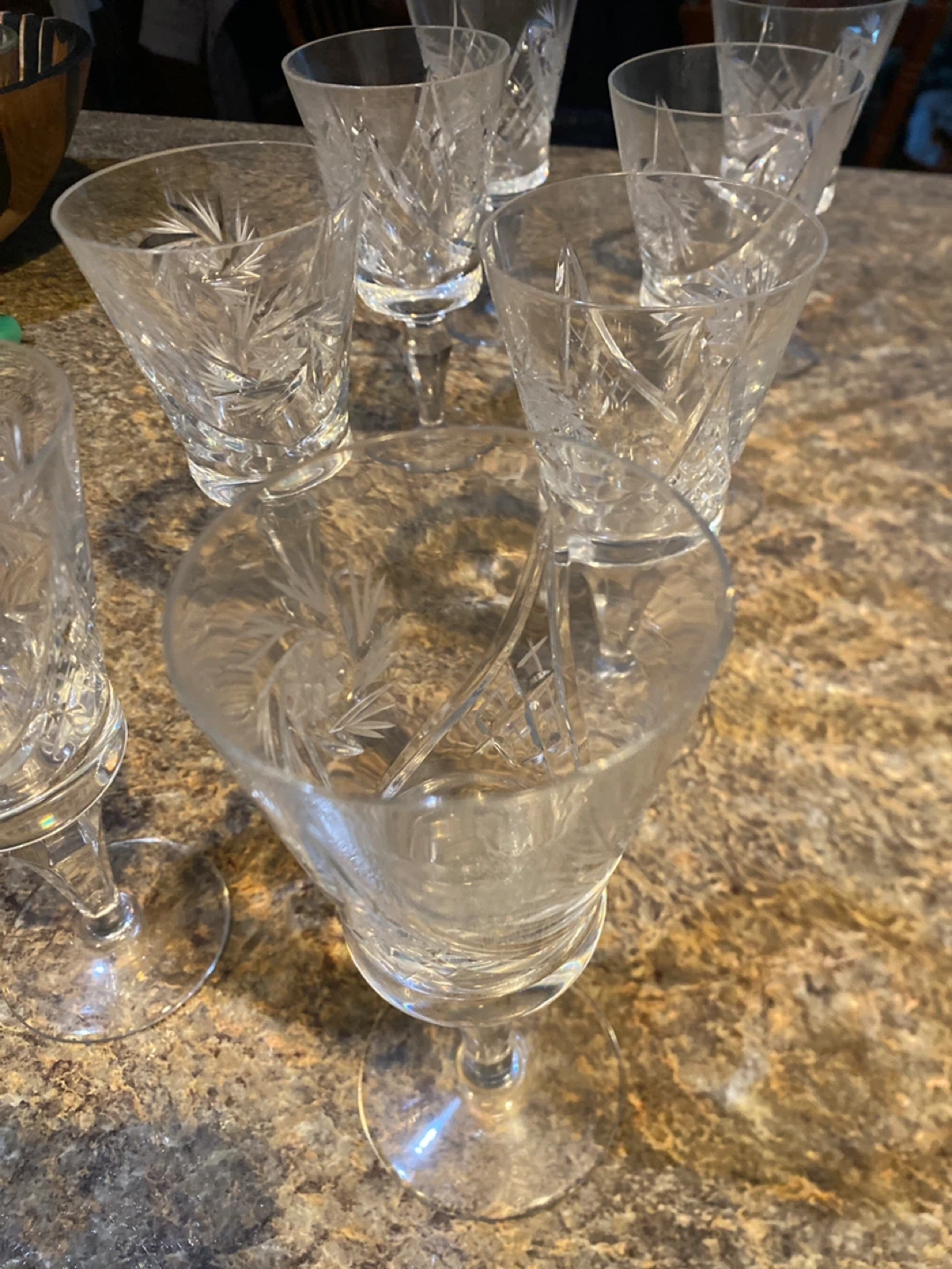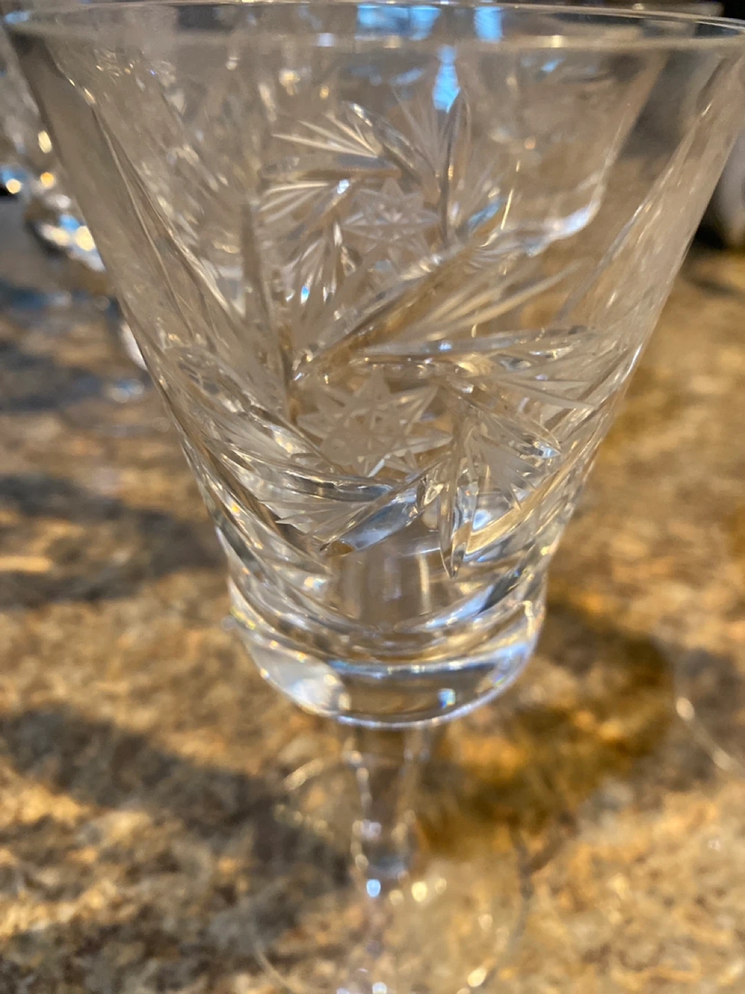 Set of eight vintage pinwheel crystal wine glasses with intricate cut detailing. These glasses are clear and feature a classic design. Each glass stands approximately 5 .5 inches tall. Perfect for serving wine or other beverages at special occasions!