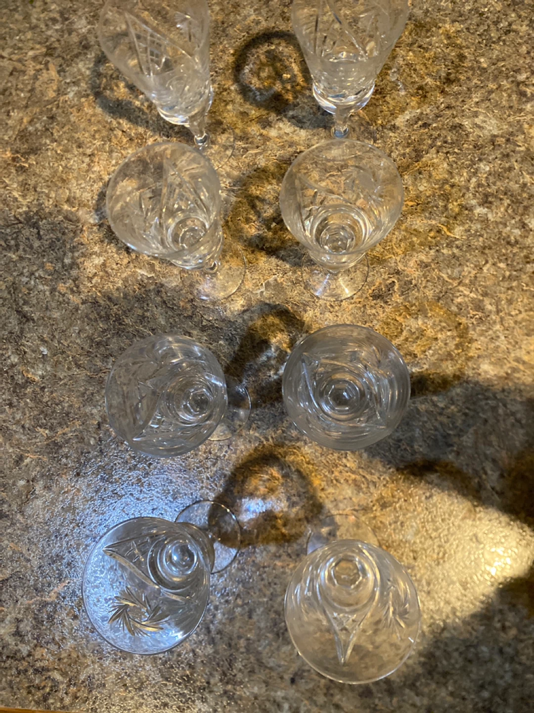 Set of eight vintage pinwheel crystal wine glasses with intricate cut detailing. These glasses are clear and feature a classic design. Each glass stands approximately 5 .5 inches tall. Perfect for serving wine or other beverages at special occasions!