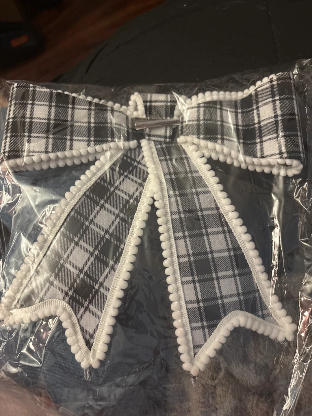 This is a cute plaid bow clip. It features a black and white checkered pattern with a white pom-pom trim. It's attached to a metal alligator clip. Perfect for adding a festive touch New
