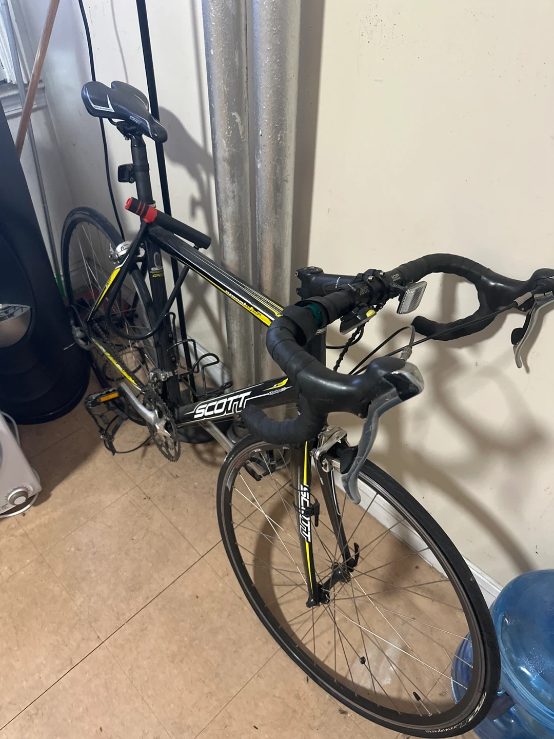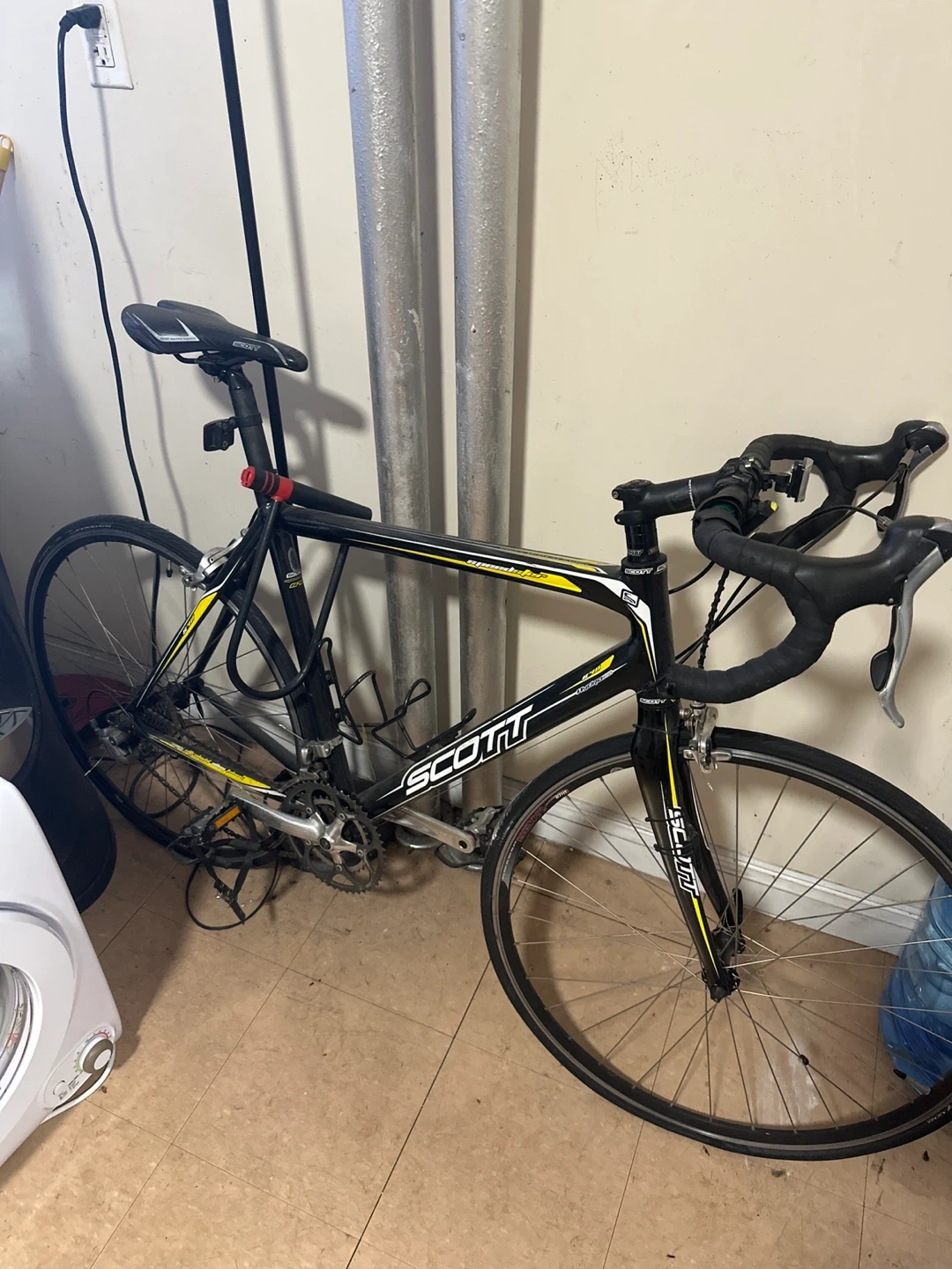Scott road bike, black and yellow. It's a complete bicycle with handlebars, seat, and wheels. Small unwinding of the handle bars just due to heat in apartment an easy fix