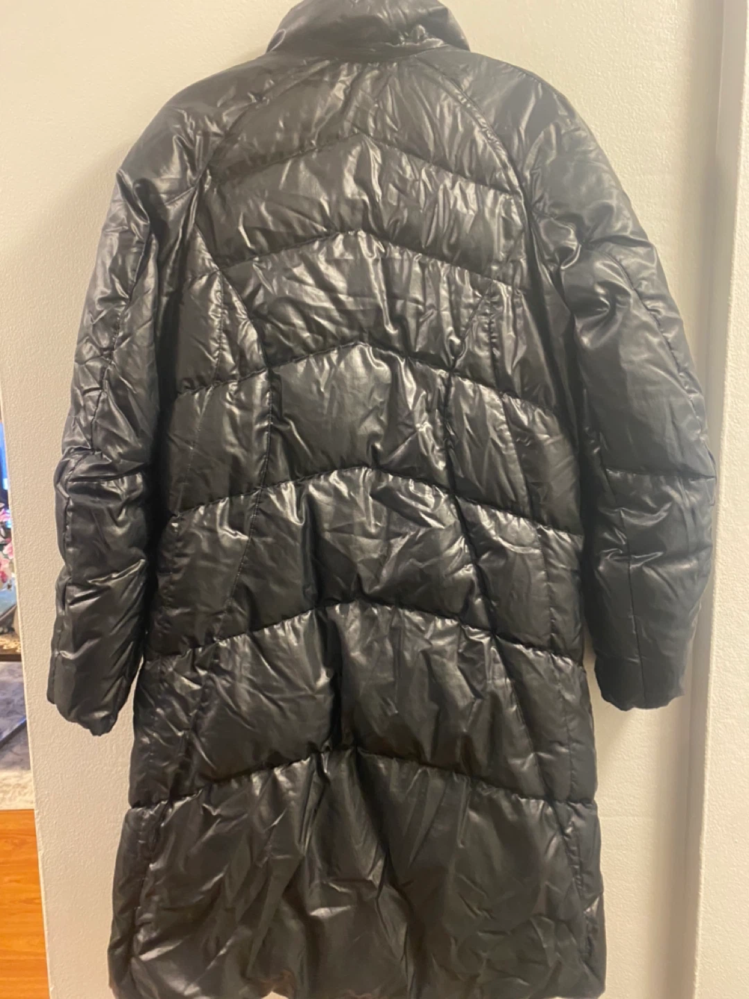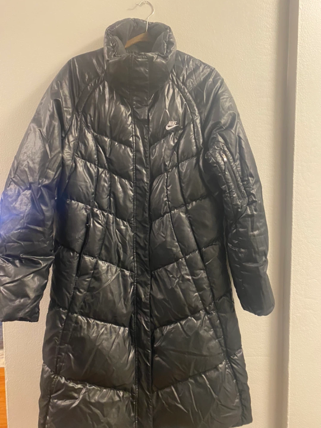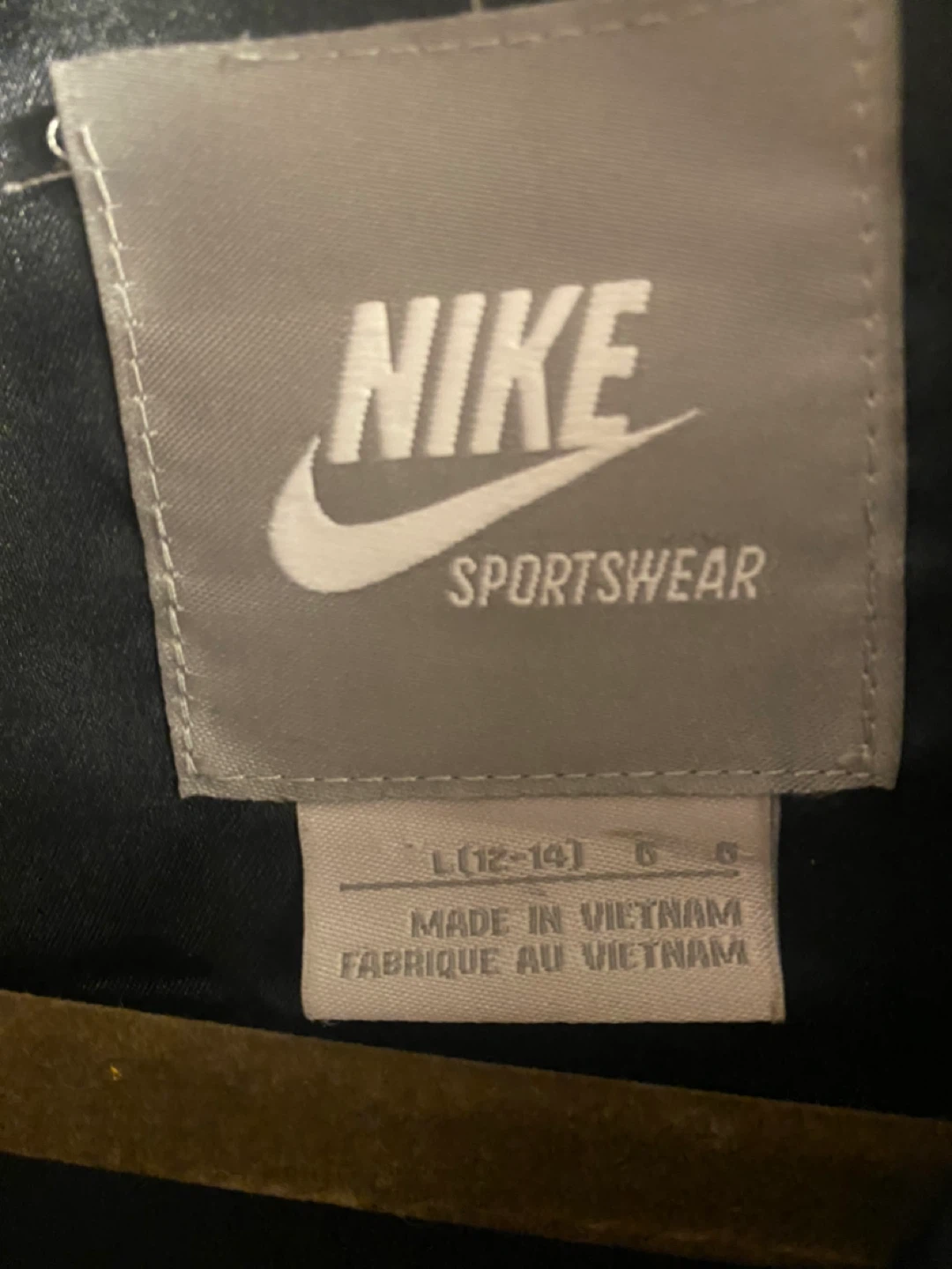 This is a black Nike Sportswear puffer coat for women. It's a size large, fitting sizes 12-14. Made in Vietnam.