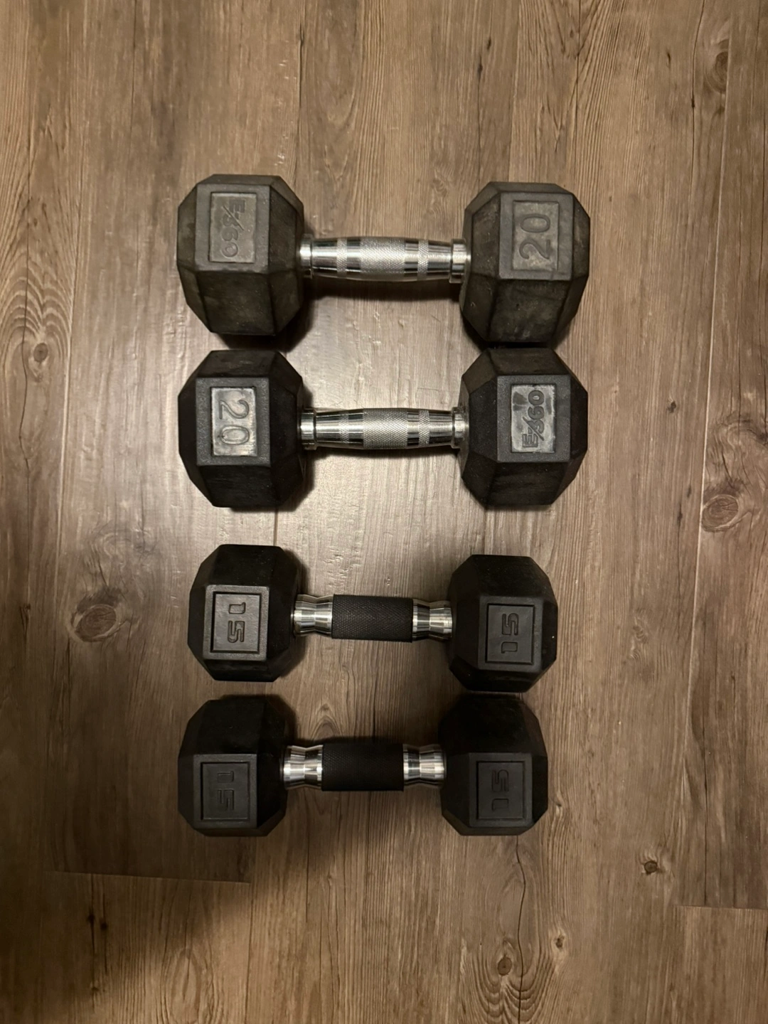 Four hex dumbbells for sale. Two 15lb and two 20lb. Good condition, minor wear from use. Great for home gym.