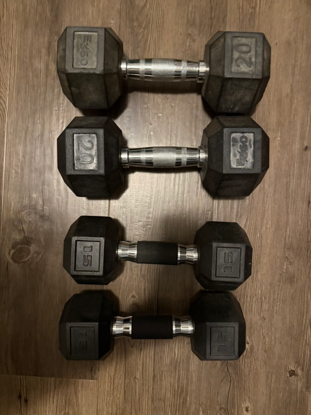 Four hex dumbbells for sale. Two 15lb and two 20lb. Good condition, minor wear from use. Great for home gym.