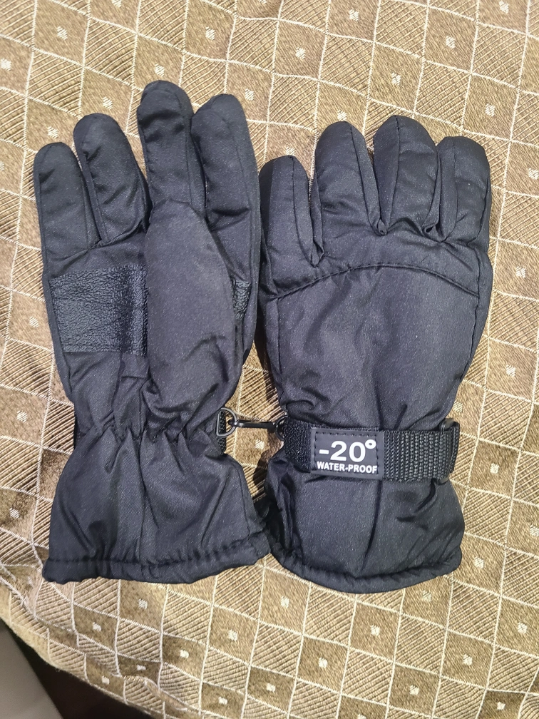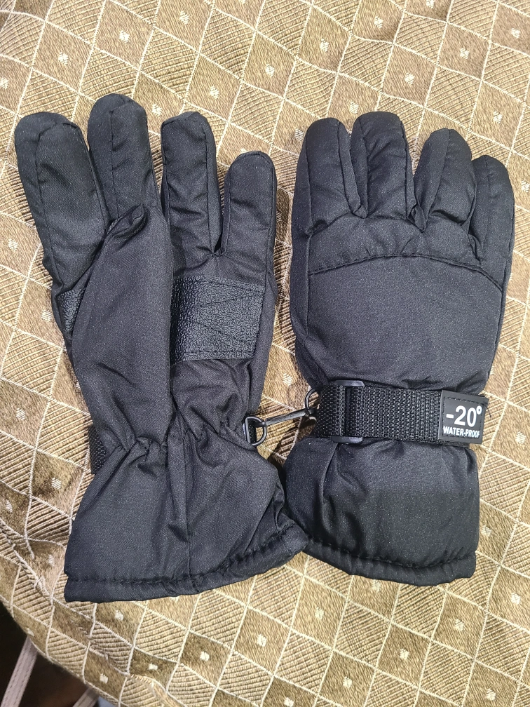 BRAND NEW - These black ski gloves are waterproof and rated for -20 degrees. They feature adjustable wrist straps for a secure fit. Great for cold weather activities! 6-10 years old.
