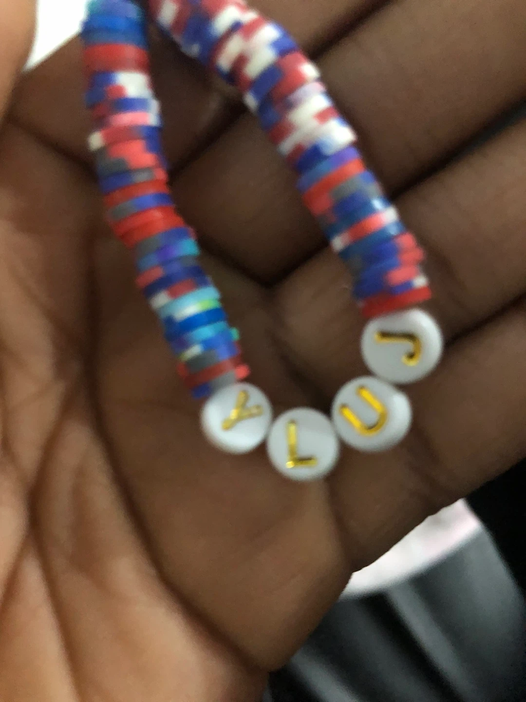 This handmade bracelet features colorful clay beads with white letter beads spelling 'JULY'. It's a fun accessory for Fourth of July
