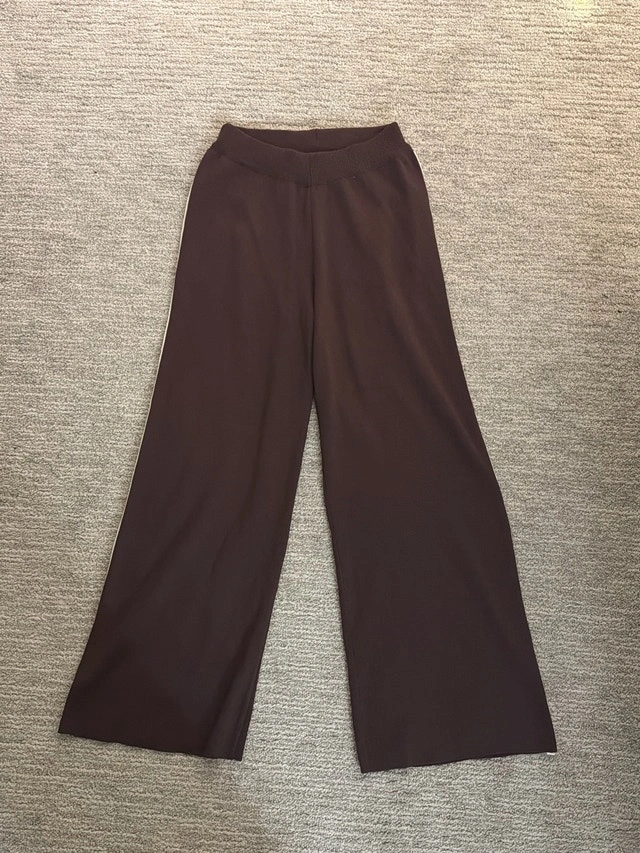 This gently used outfit set features a fashionable brown polo-style, zip-up top and wide-leg pants, perfect for a stylish and comfortable look. It's in good condition and ready to elevate your wardrobe.