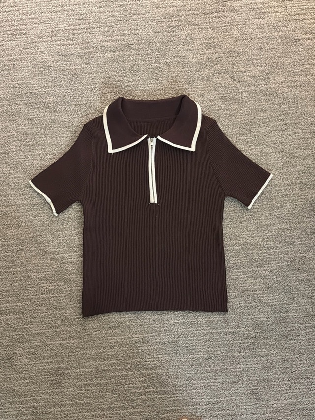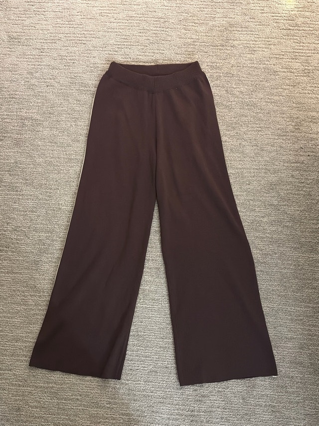 This gently used outfit set features a fashionable brown polo-style, zip-up top and wide-leg pants, perfect for a stylish and comfortable look. It's in good condition and ready to elevate your wardrobe.