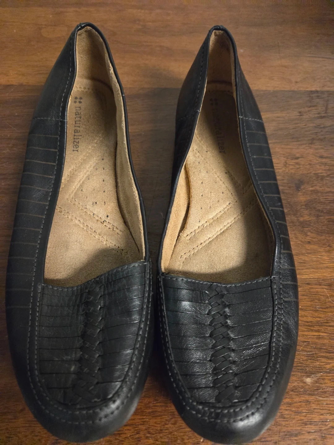 These Naturalizer loafers are black and made of leather. They're a women's size 7 medium. Perfect for everyday wear!