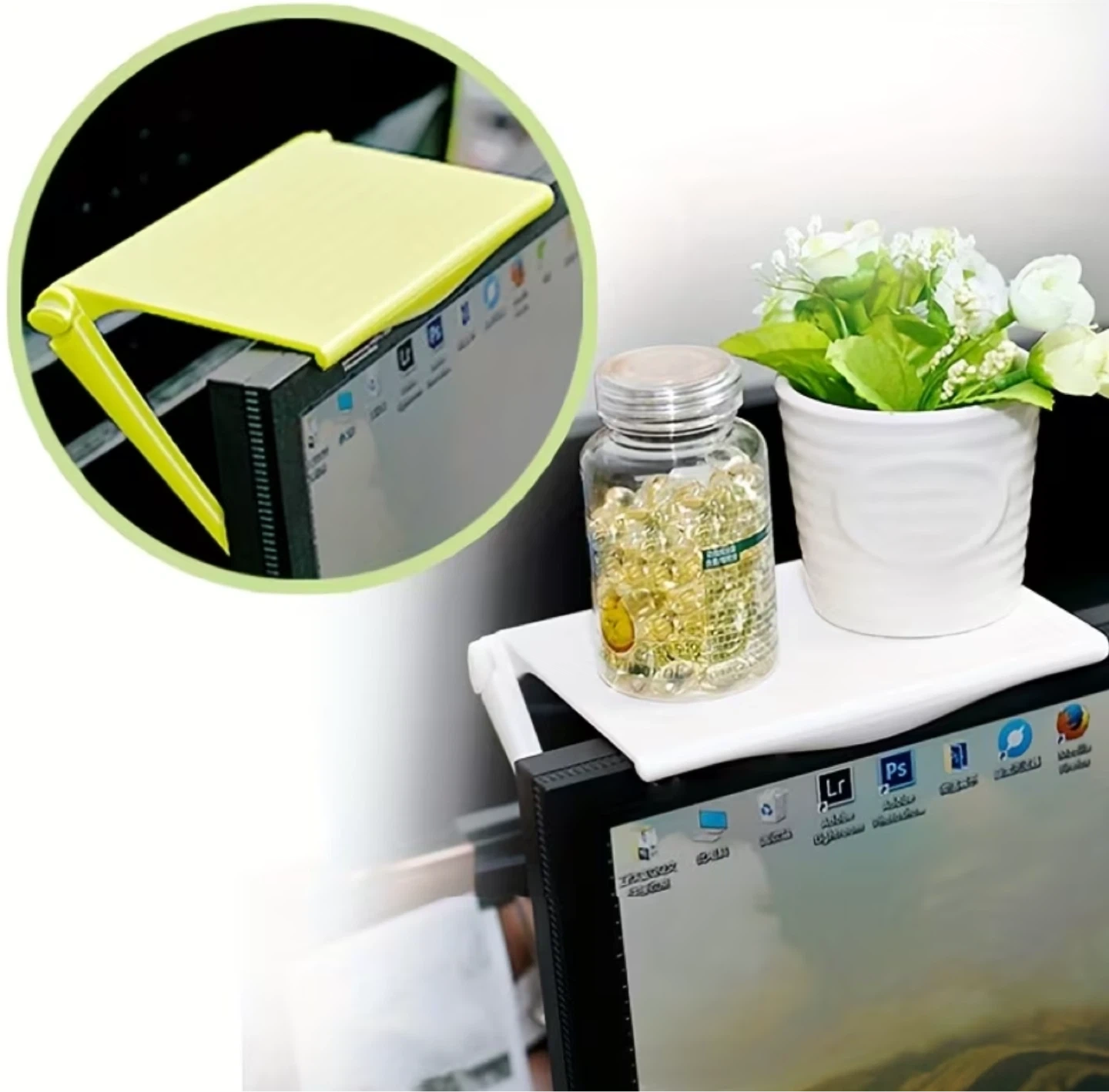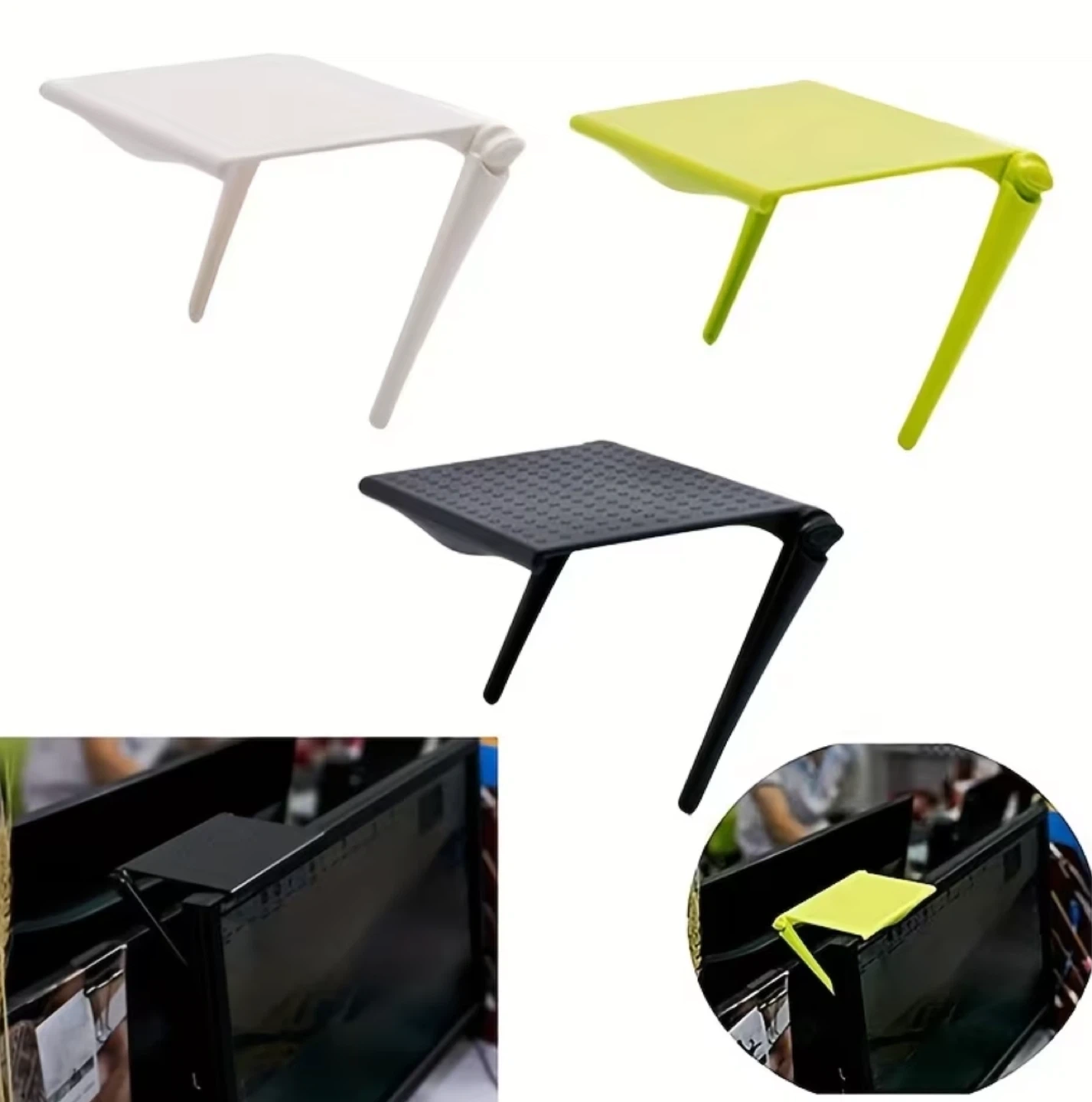 This shelf easily attaches to the top of your monitor or TV. It's perfect for holding small items like remotes or decorative plants. Made of durable plastic, its adjustable design fits most screens.