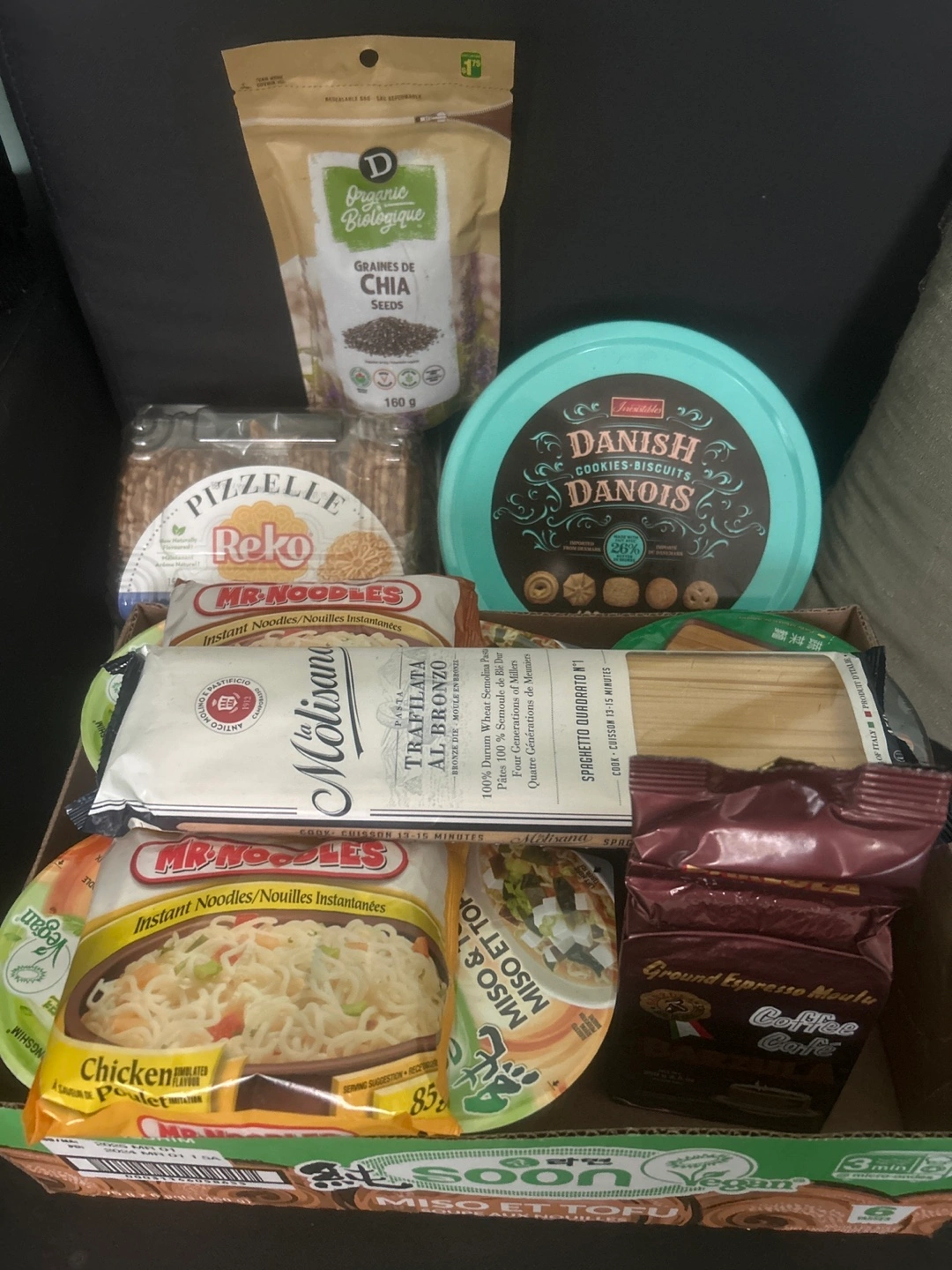 Assortment of food items. Includes instant noodles, Danish cookies, chia seeds, pasta, and more. Perfect for stocking up your pantry or trying new things.