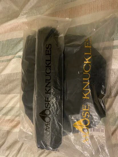 This black Moose Knuckles bomber jacket is down-filled for warmth. It's a size S/P. Features a fur-lined hood and the signature Moose Knuckles logo detailing. It's a really good 1:1