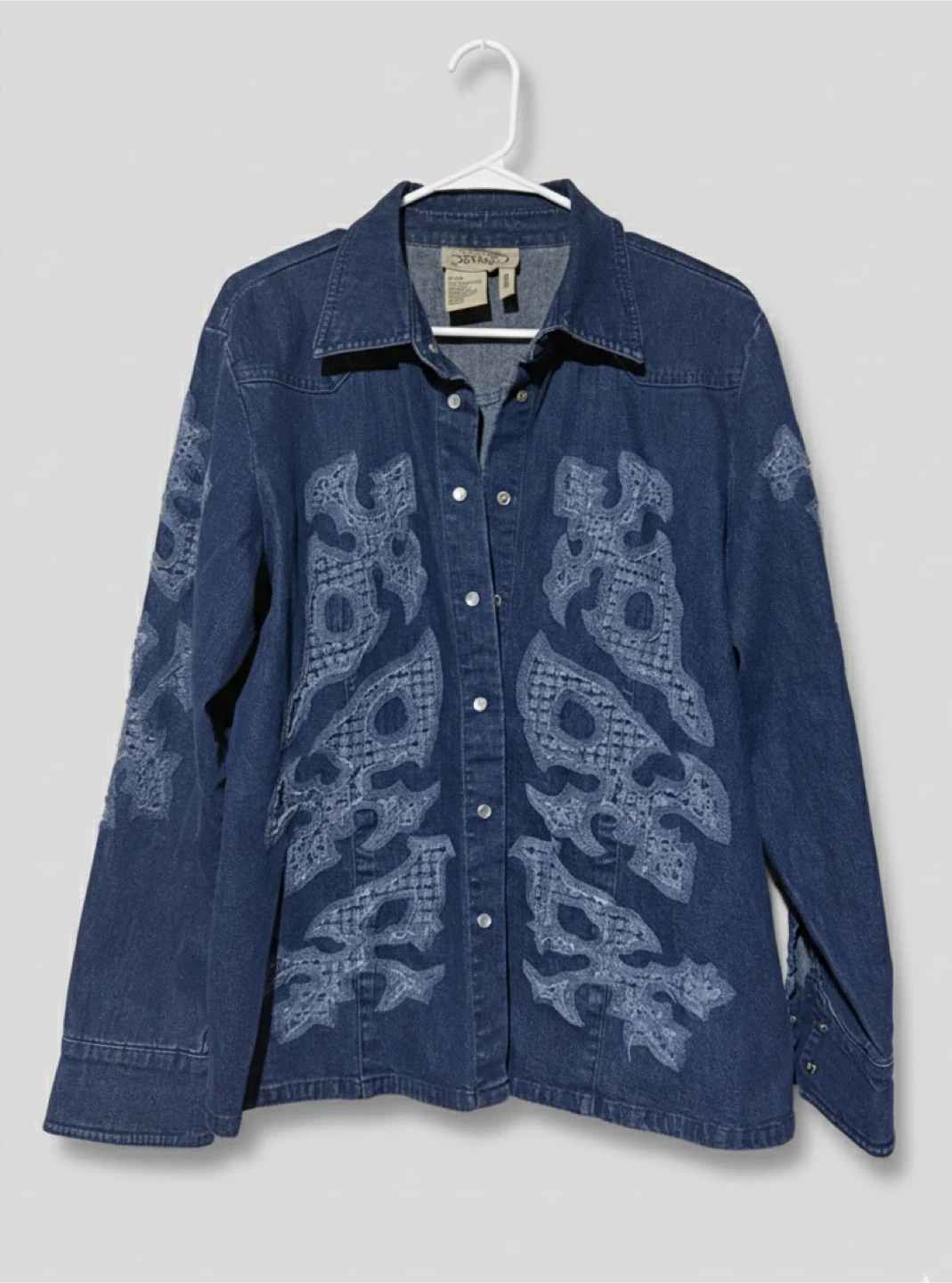 Buy & SellBlue Denim Embroidered Jacket/ShirtBlue Denim Embroidered Jacket/Shirt$11Blue denim long-sleeve shirt with light blue embroidery. It's a classic button-up style with a collar and button cuffs. 97% cotton.ConditionLike newSize14BrandCONRADCWHERE TO MEETDownsview Park/StationView MapSELLERverifiedSofiaDownsview792 reviews0 chats·2 favorites·12 viewsSEND CHAT TO SELLERHi Sofia! I’m interested in your listing.Hi Sofia! I’m interested in your listing.Get the Karrot app to chatSign In to chat