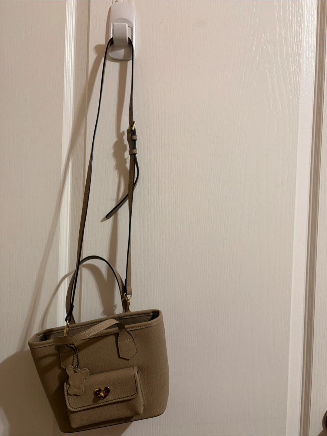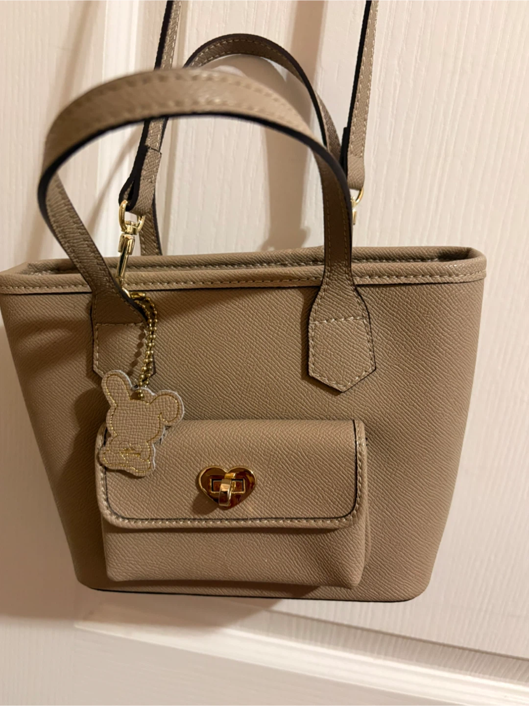 A cute beige mini tote bag of House of little bunny. It has a small pocket on the front with a heart-shaped clasp and a little bunny charm. Made from Bangkok 🇹ðŸ‡. Originally $130 CAD