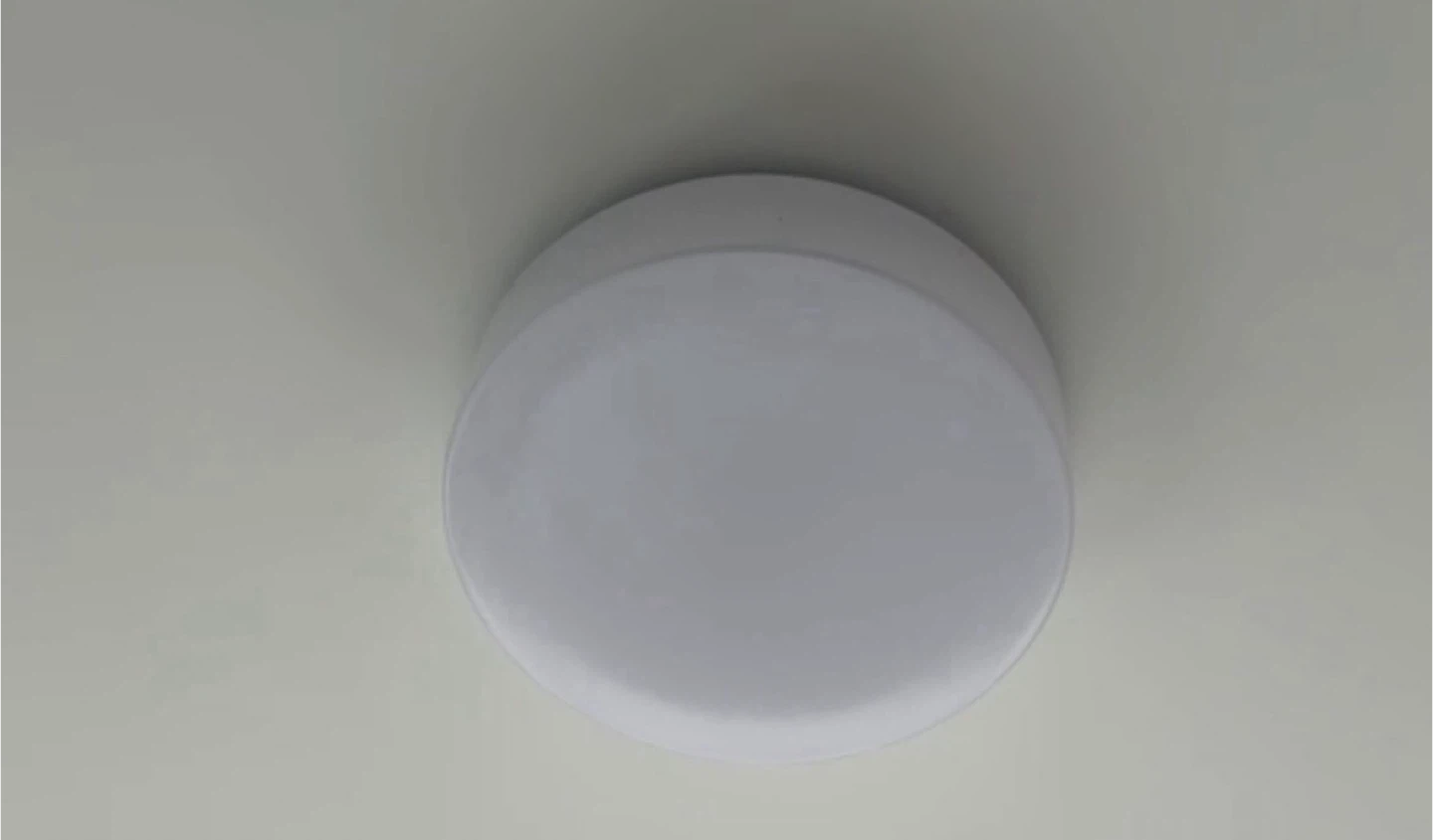 A simple white ceiling light fixture. Its clean design fits most rooms. It provides bright illumination. Made of durable plastic.