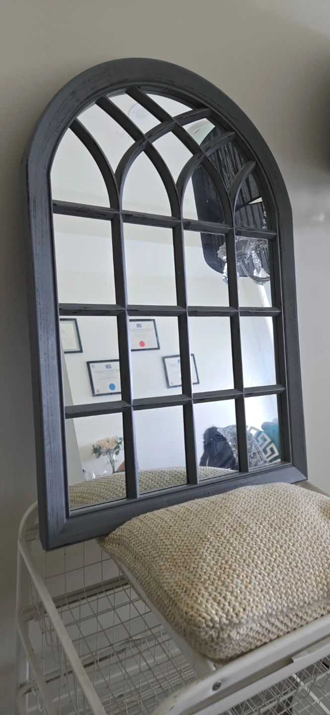 Add a touch of vintage charm with this arched window pane style mirror. It's a lovely accent piece for any room. The distressed grey frame gives it a rustic feel.