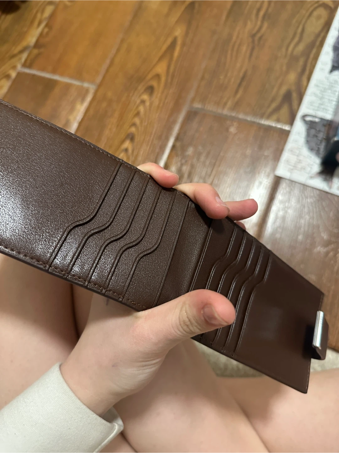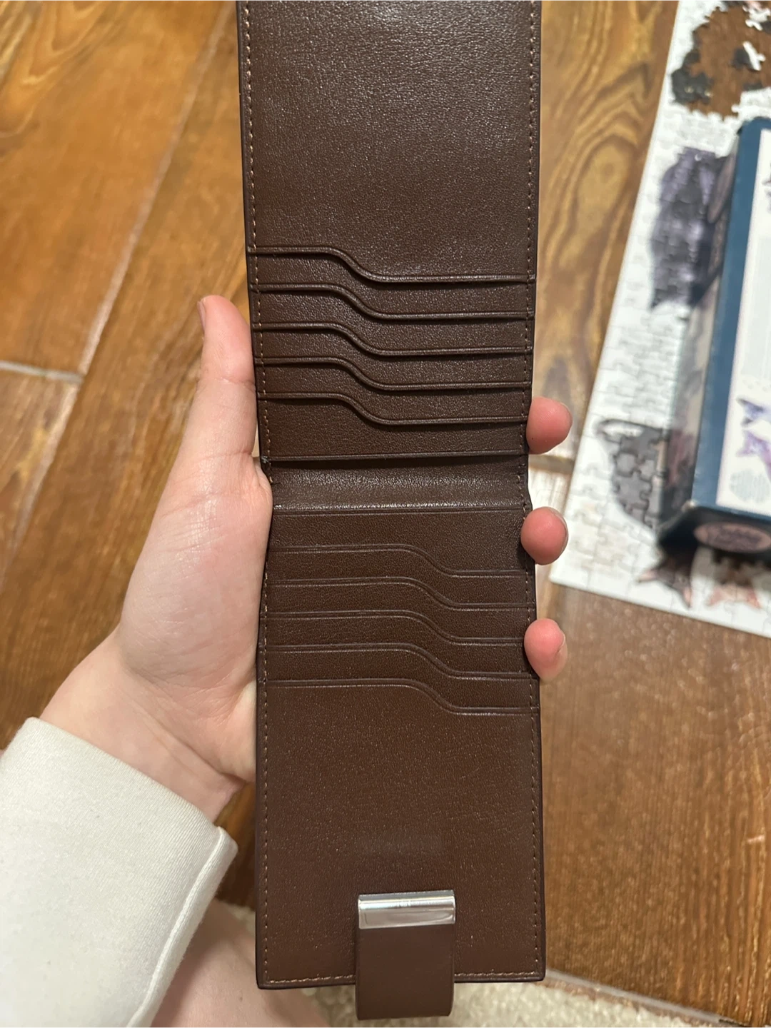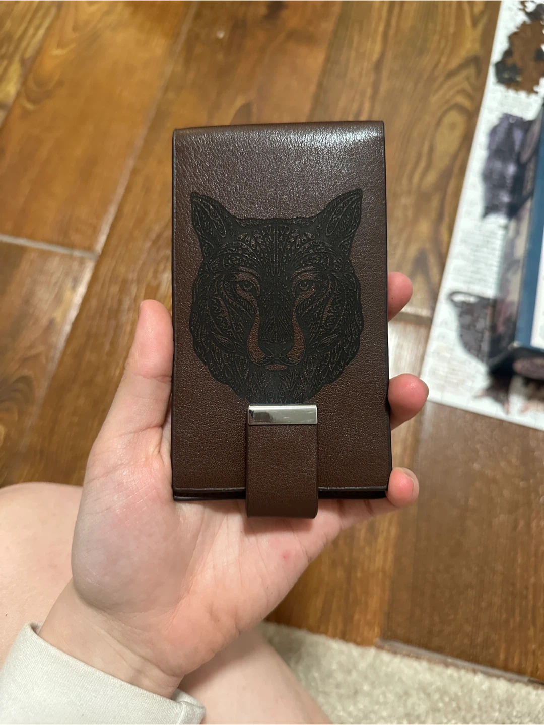 Brown bi-fold wallet with wolf embossing on the front. It's made of faux leather and has multiple card slots inside. A great way to keep your cards organized!