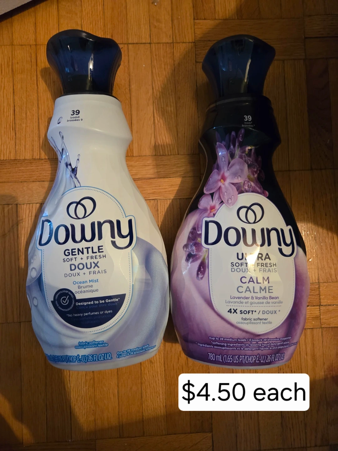 Downy fabric softener. One is Gentle Ocean Mist scent, and the other is Ultra Calm Lavender & Vanilla Bean scent. Each bottle contains 26 fl oz (780 mL) and provides up to 39 loads.
