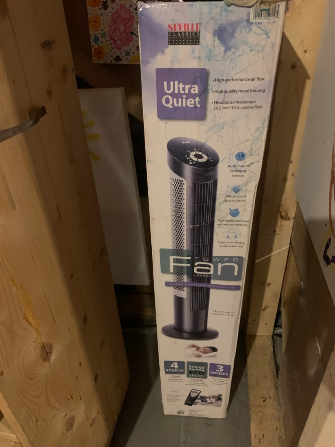 Selling a Seville Classics Ultra Quiet Tower Fan! It features high-performance air flow and a high-quality metal housing. It also has elevated air movement at 34.2 cm / 13.5 inches above the floor. The fan has an auto shut-off feature for energy savings and whole room air circulation. It's equipped with push-button operation and easy-to-read LEDs, and can be adjusted to oscillate or remain stationary. It has 4 speeds, energy-saving ECO speed, and 3 modes