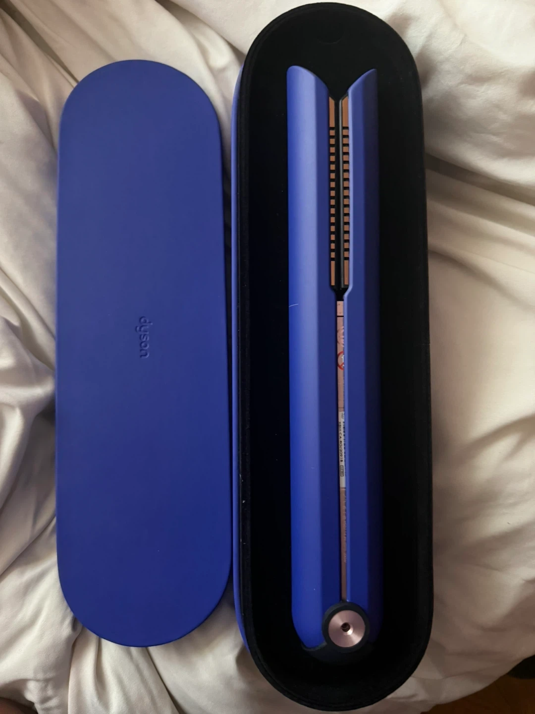 This is a Dyson Corrale straightener in blue. It includes its original charging stand and travel case. It's a cordless hair straightener with flexible plates.