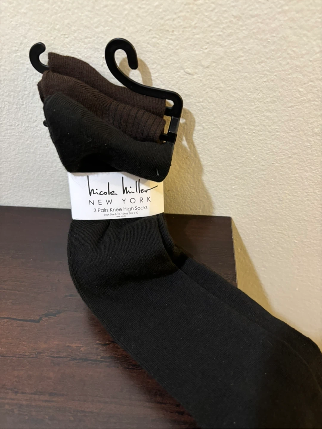 Three pairs of Nicole Miller knee-high socks are included. They're black and brown. Sock size is 9-11, fitting shoe sizes 5-10.