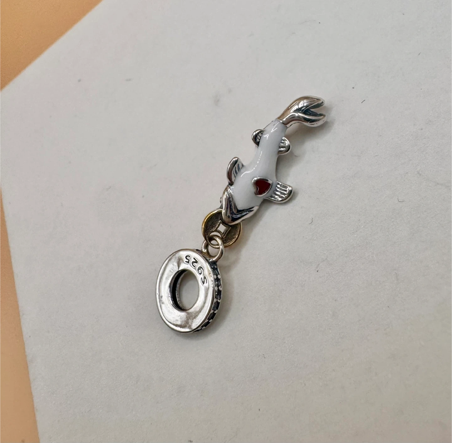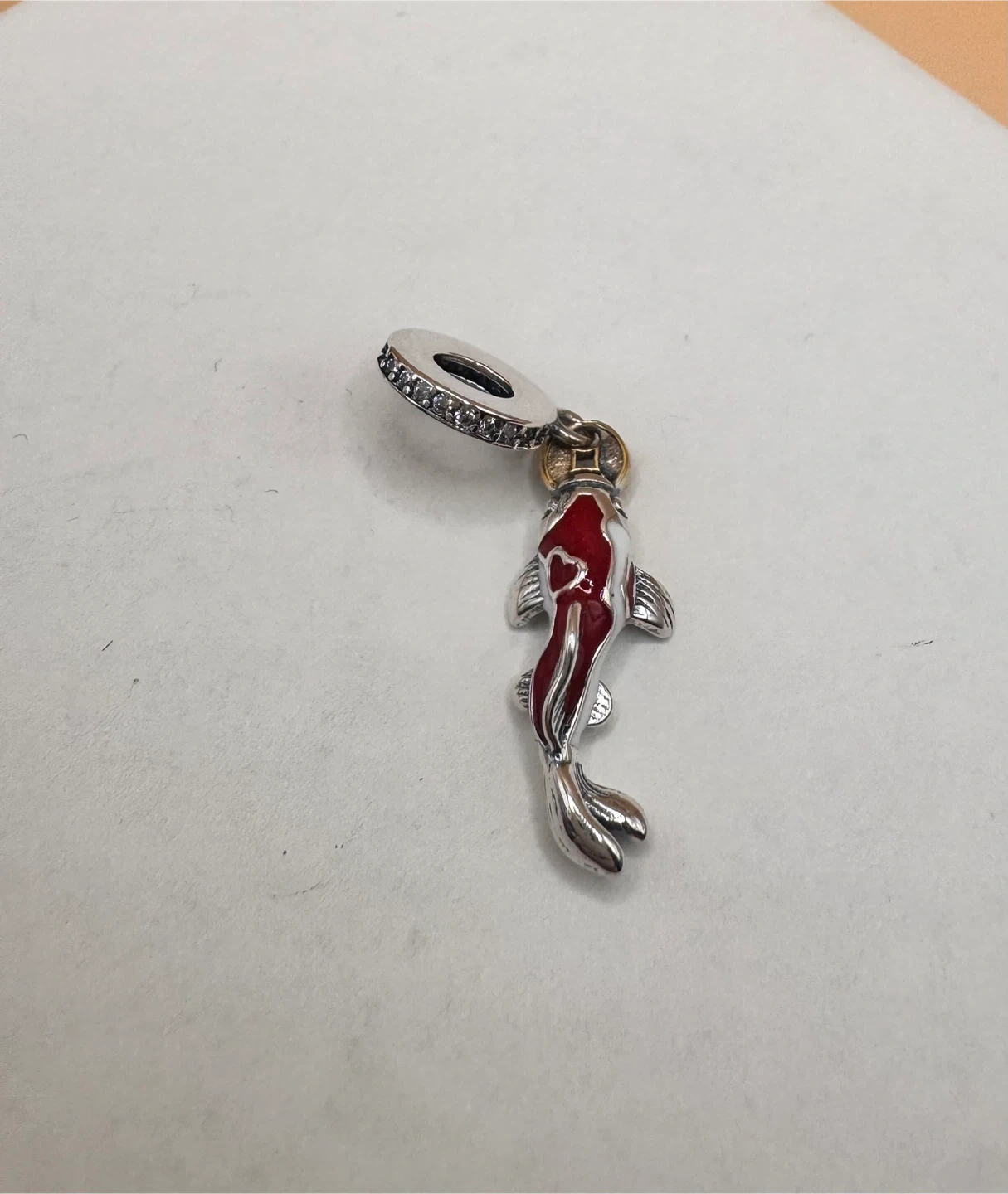 Sterling silver charm shaped like a red and white koi fish. It has a loop for attaching to a bracelet. S925 This charm is great for adding a unique touch to your jewellery collection.