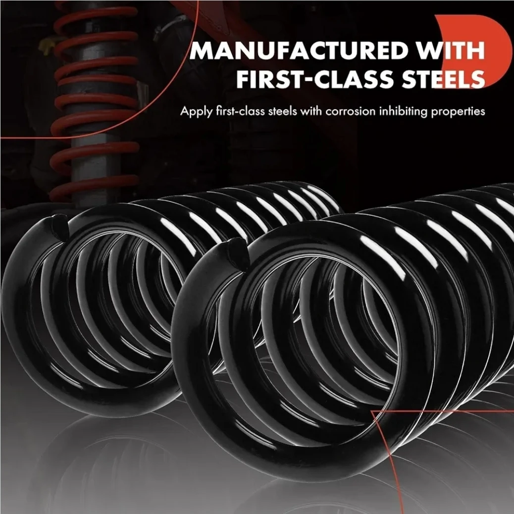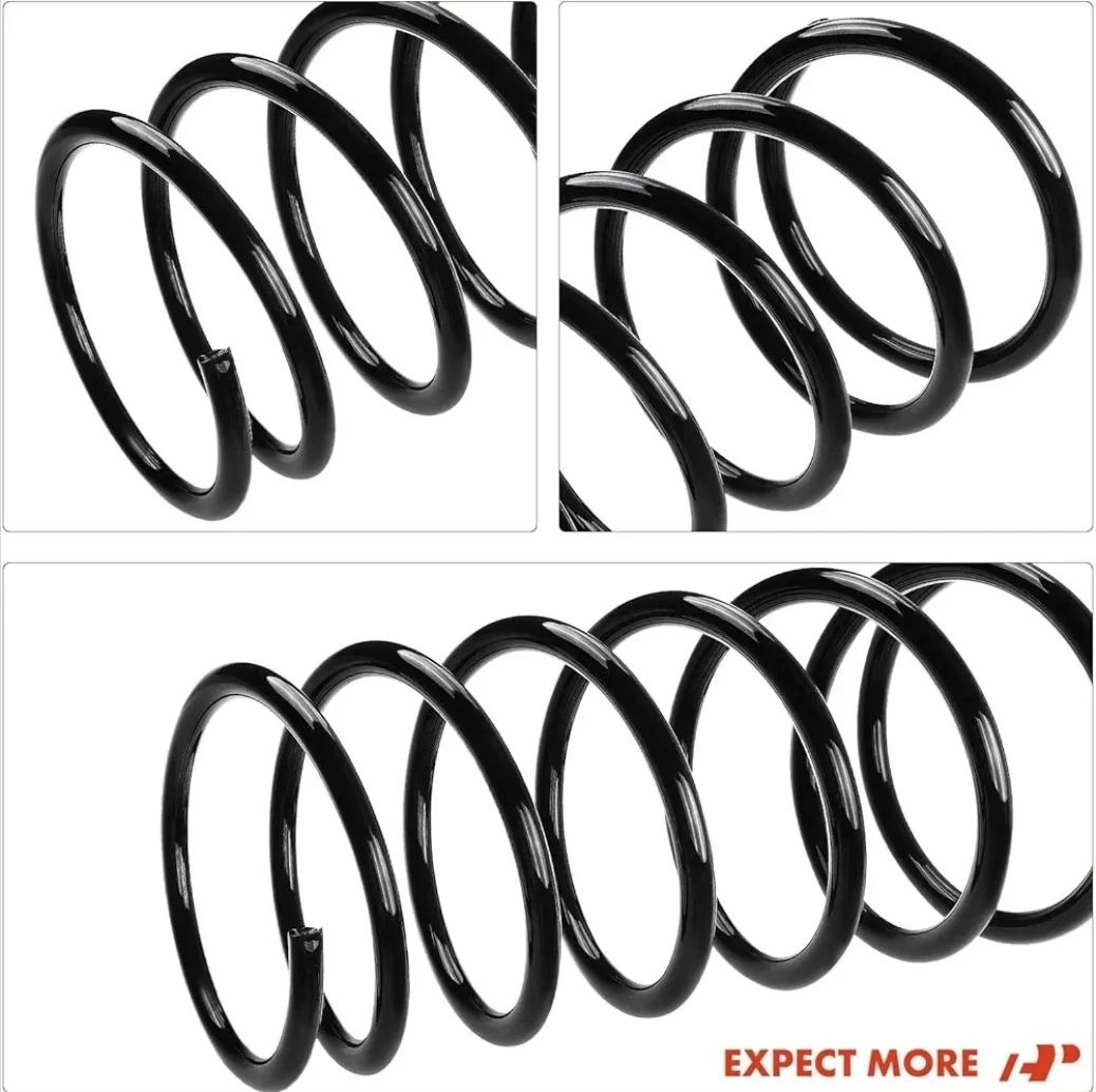 This set includes two front suspension coil springs manufactured with first-class steels. Each spring wears a black coating to prevent corrosion and is designed to absorb shock. These springs support the vehicle and cushion the ride.