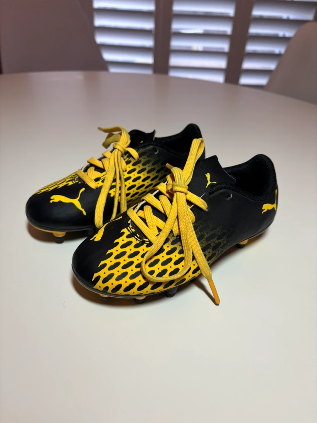 Puma soccer cleats in a black and yellow colourway. Features cleats for traction on the field. Little kids size 10.
