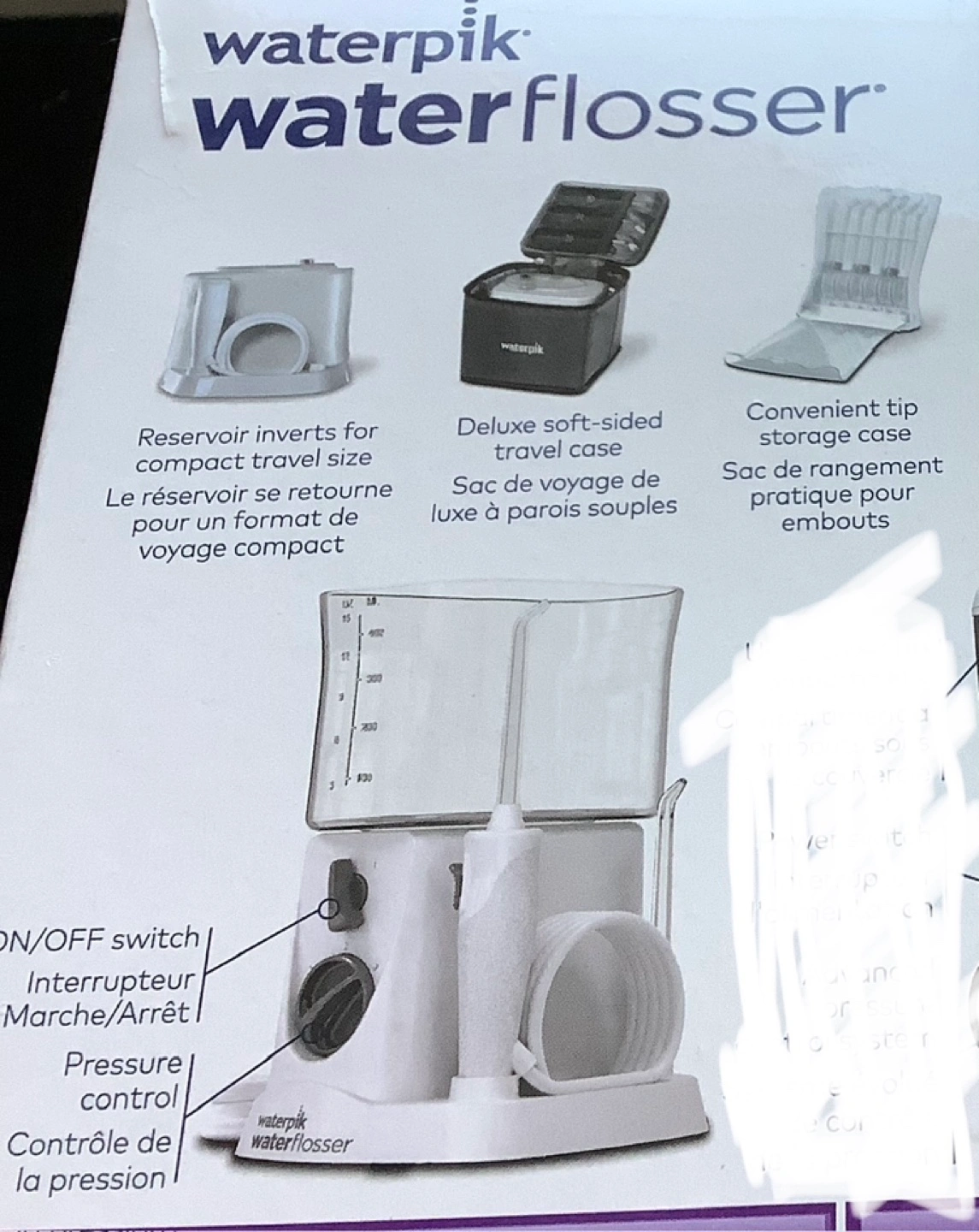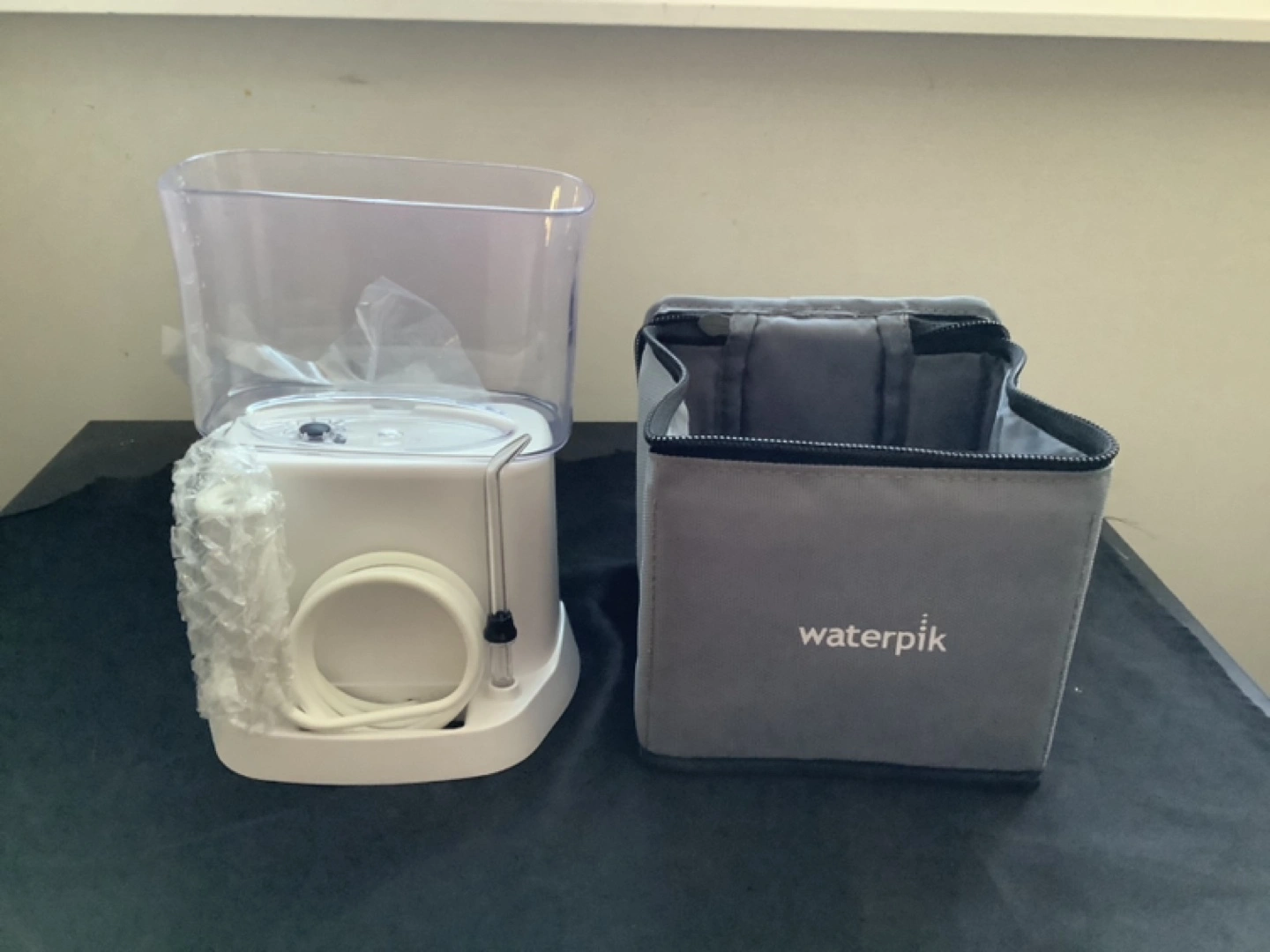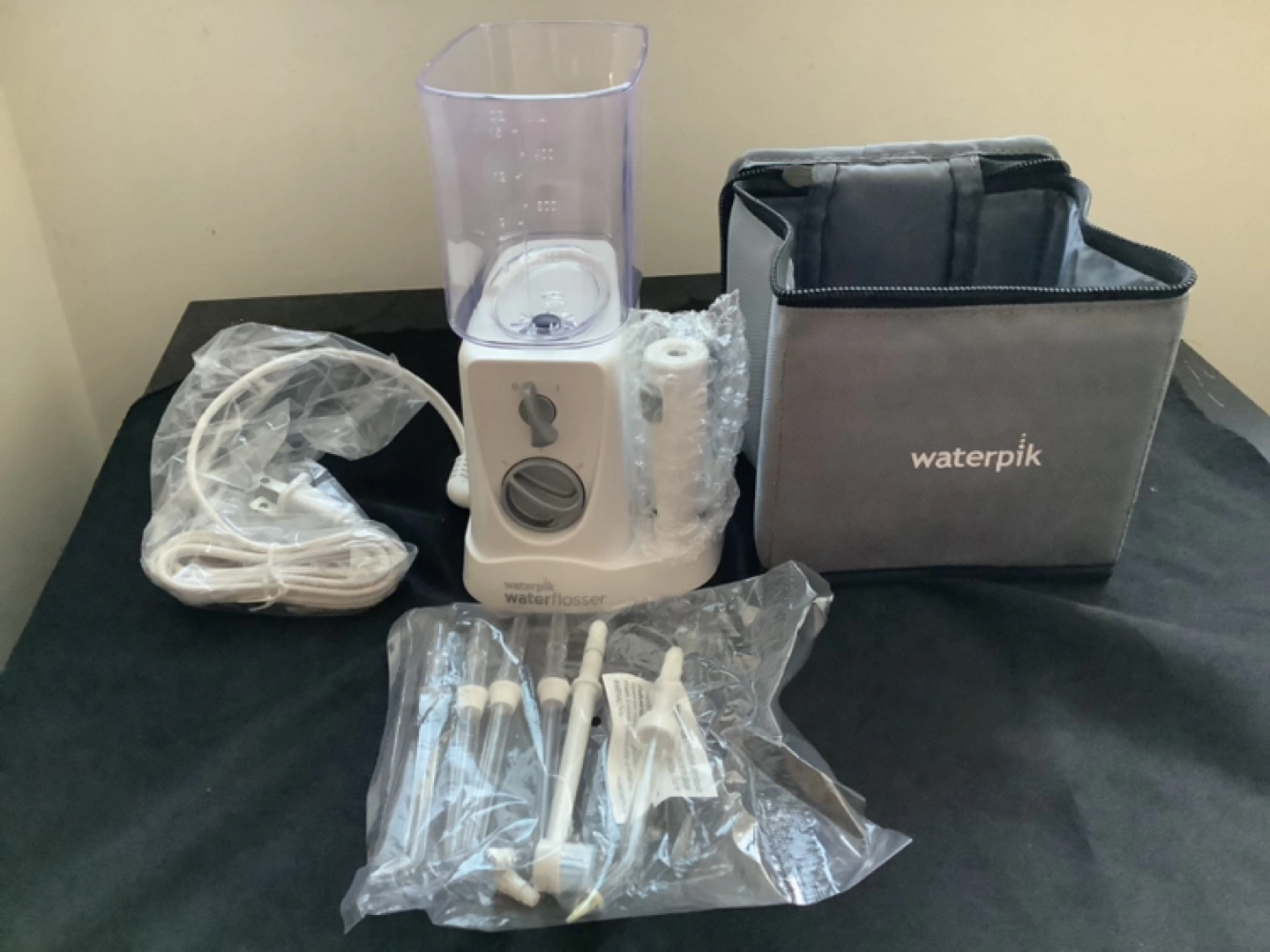 New Waterpik Nano water flosser. Includes multiple tips, travel case, and power cord. Compact and easy to use. Great for travel.