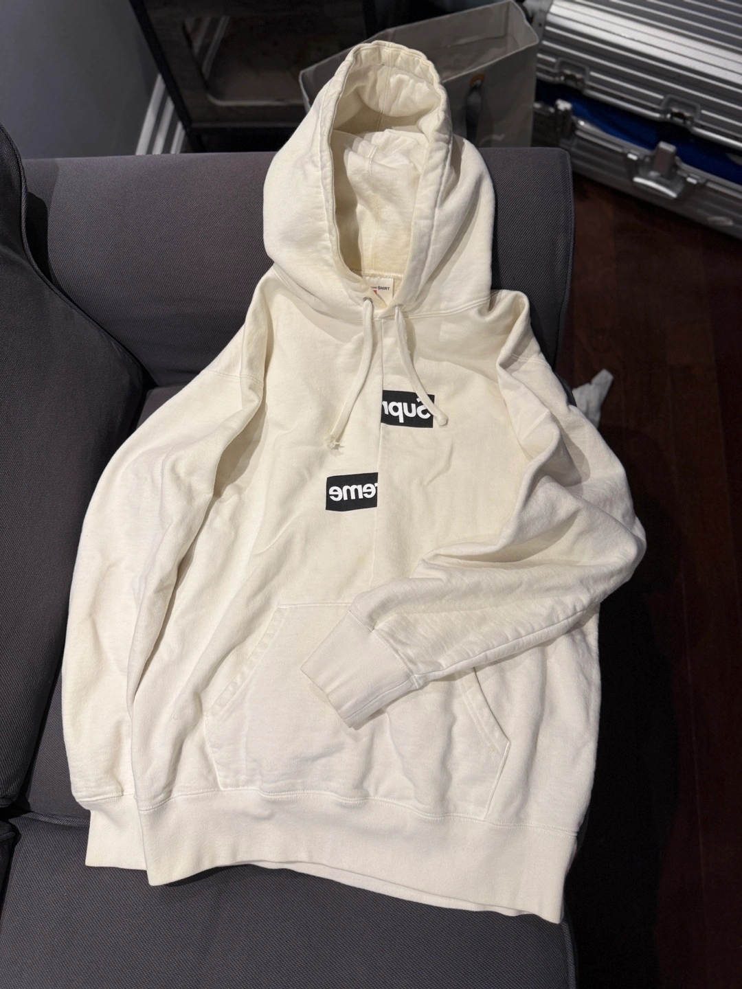 Cream coloured hoodie. Features a split box logo on the front. Size Medium. Back features COMME des GARÇONS SHIRT branding.