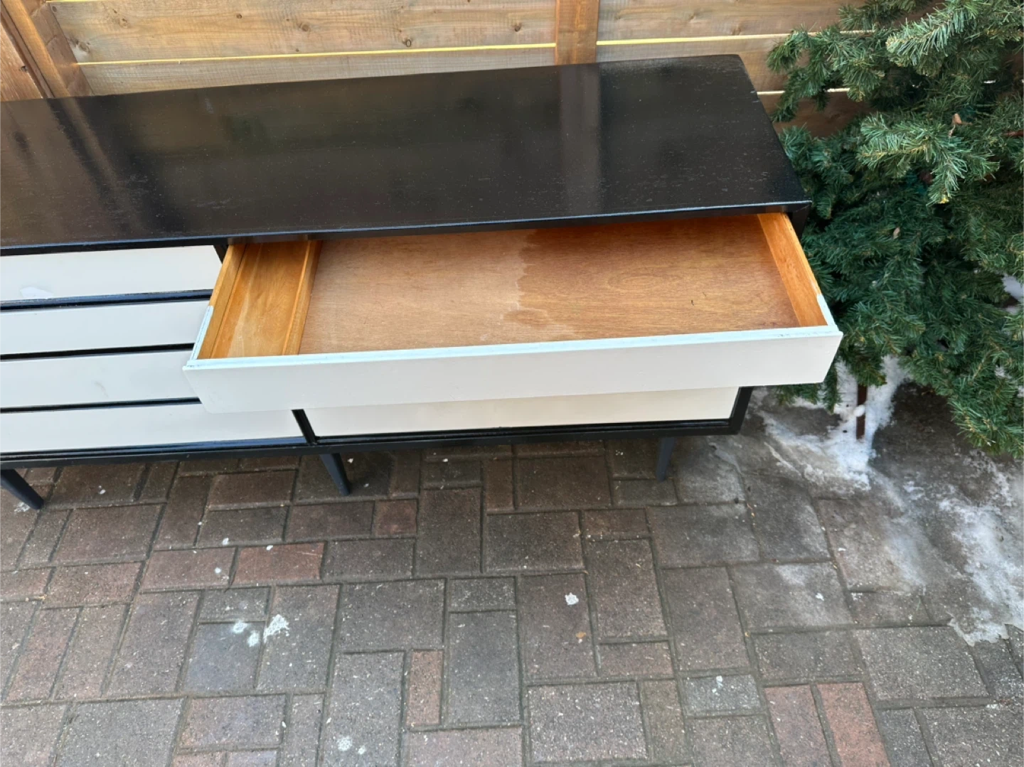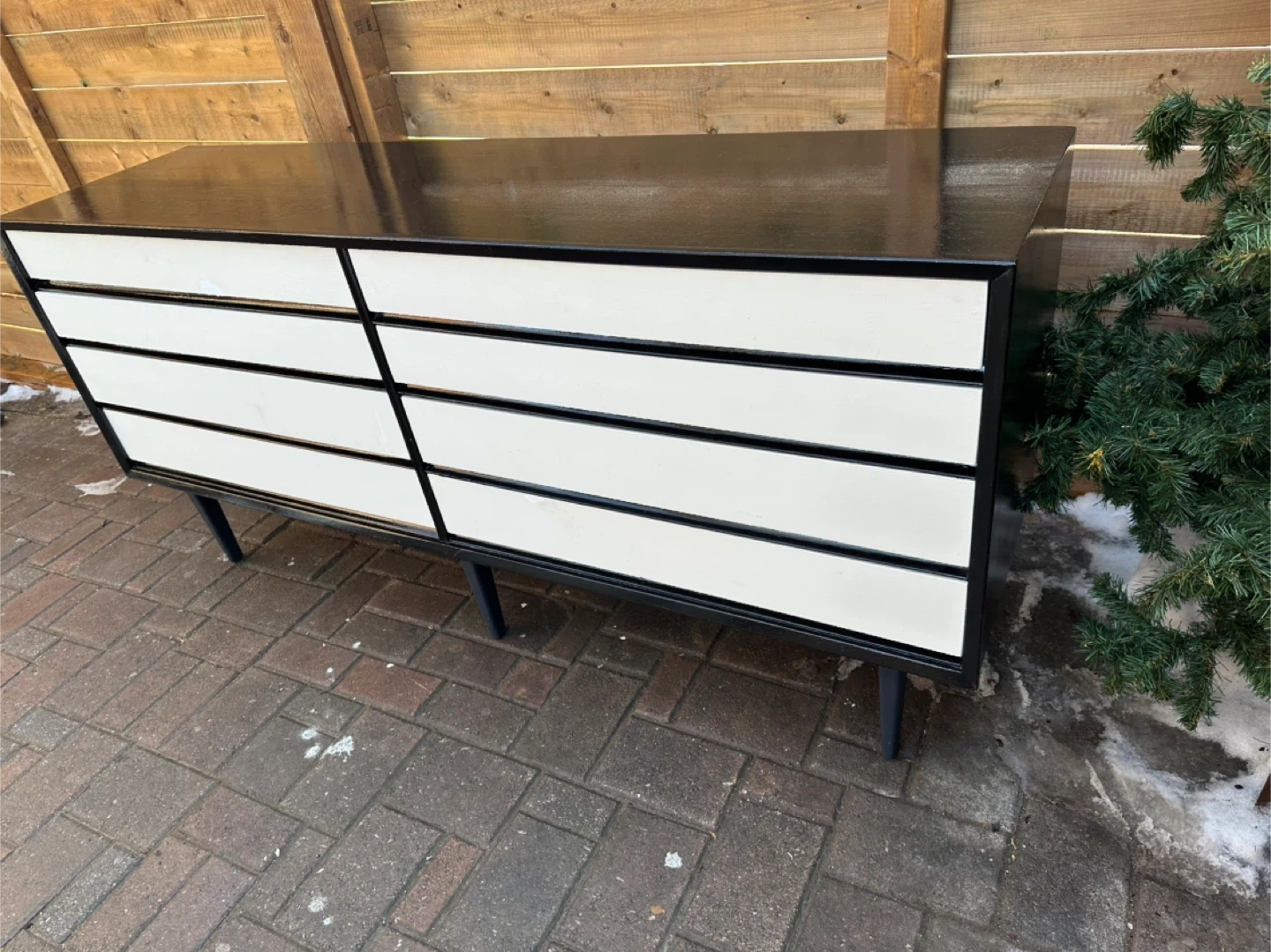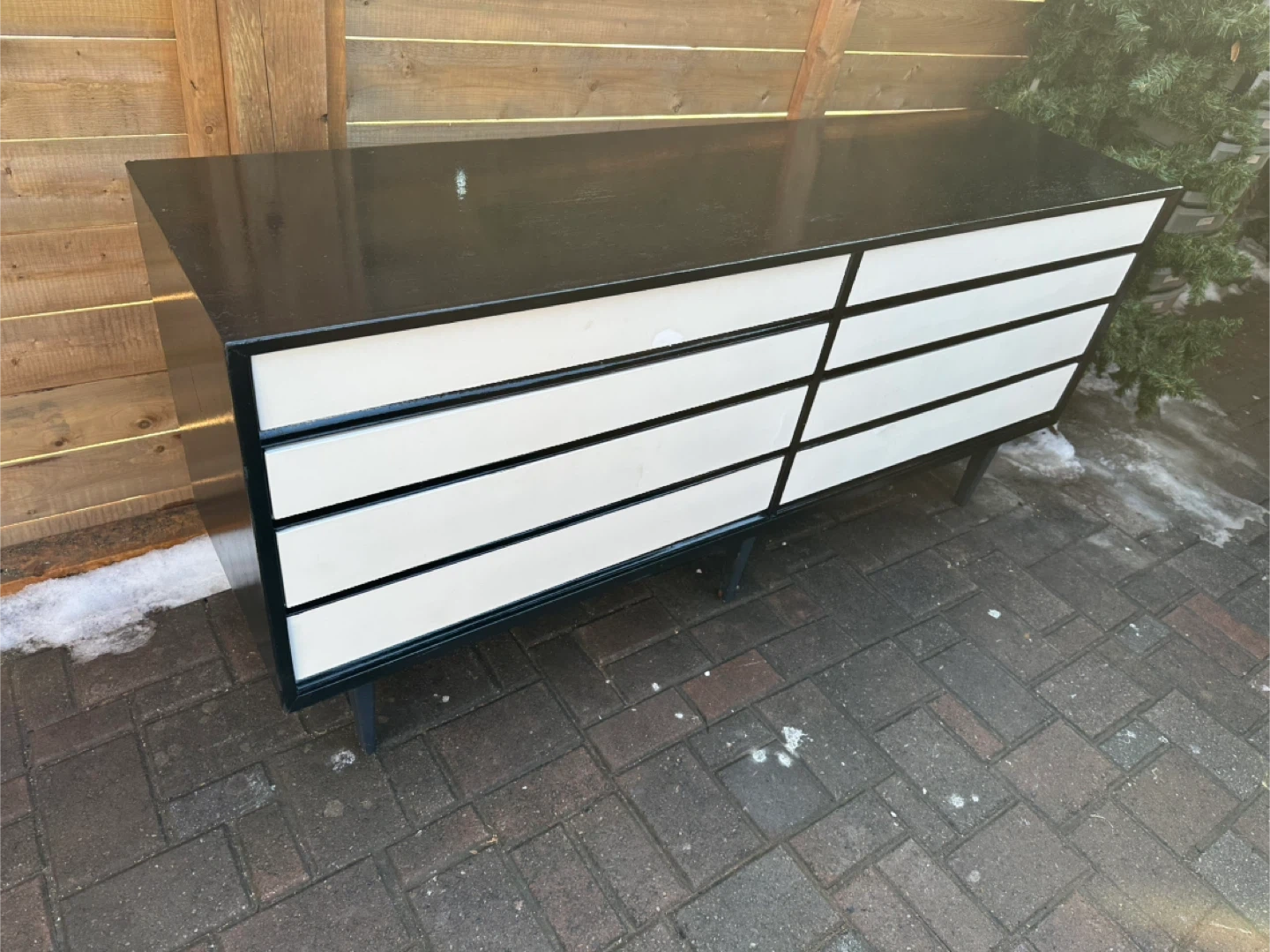 A sleek dresser or credenza a glossy black top and white drawer fronts with black accents. It has six drawers for ample storage. This piece would be a stylish addition to any bedroom or living area.