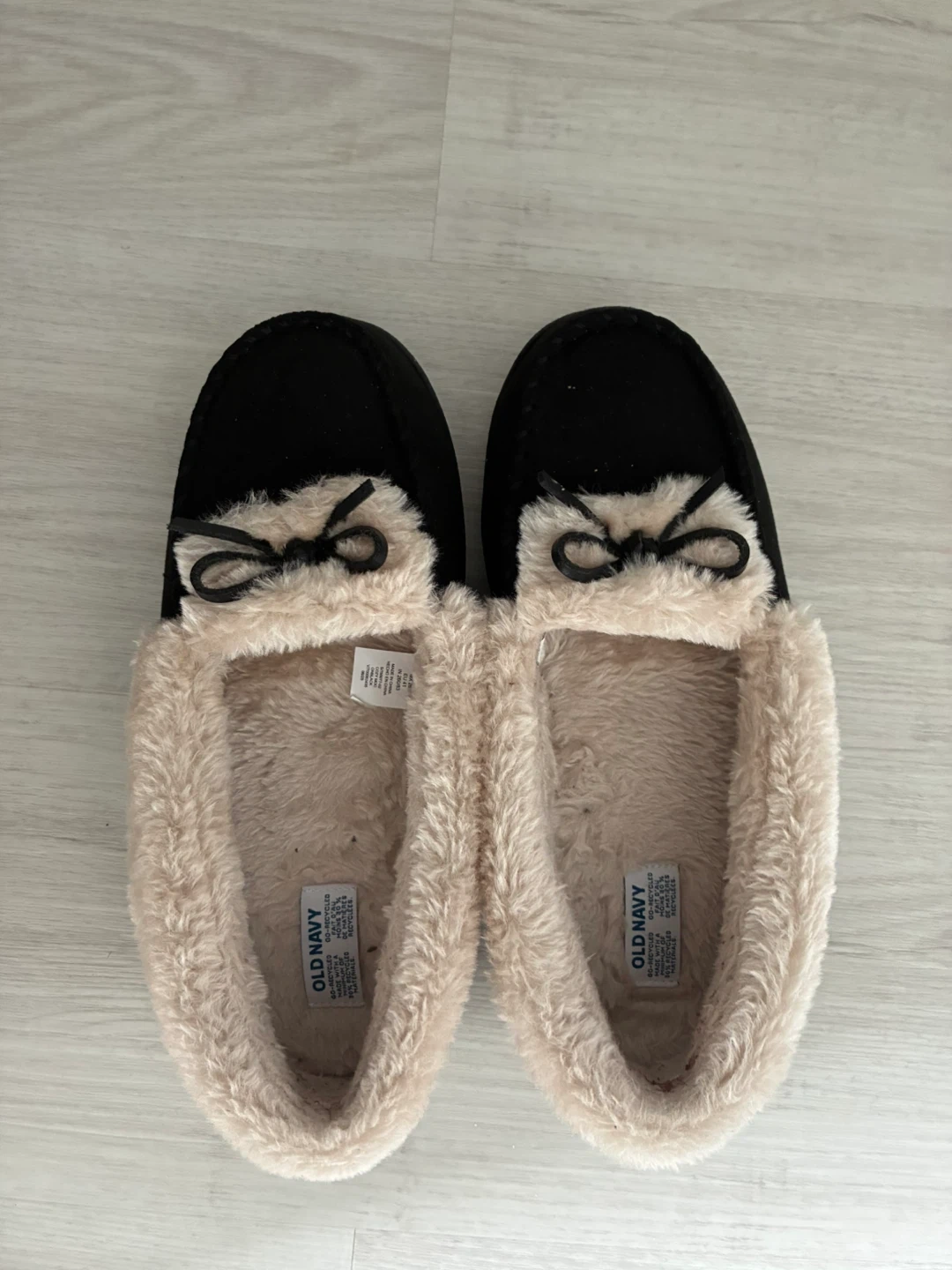 Comfy black moccasin slippers from Old Navy. They're lined with cozy sherpa for extra warmth. Features a cute bow accent on the front. Great for lounging around the house!