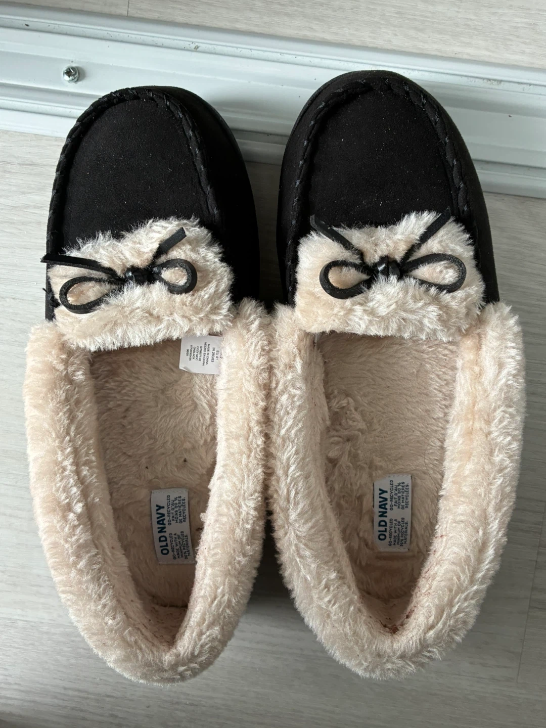 Comfy black moccasin slippers from Old Navy. They're lined with cozy sherpa for extra warmth. Features a cute bow accent on the front. Great for lounging around the house!