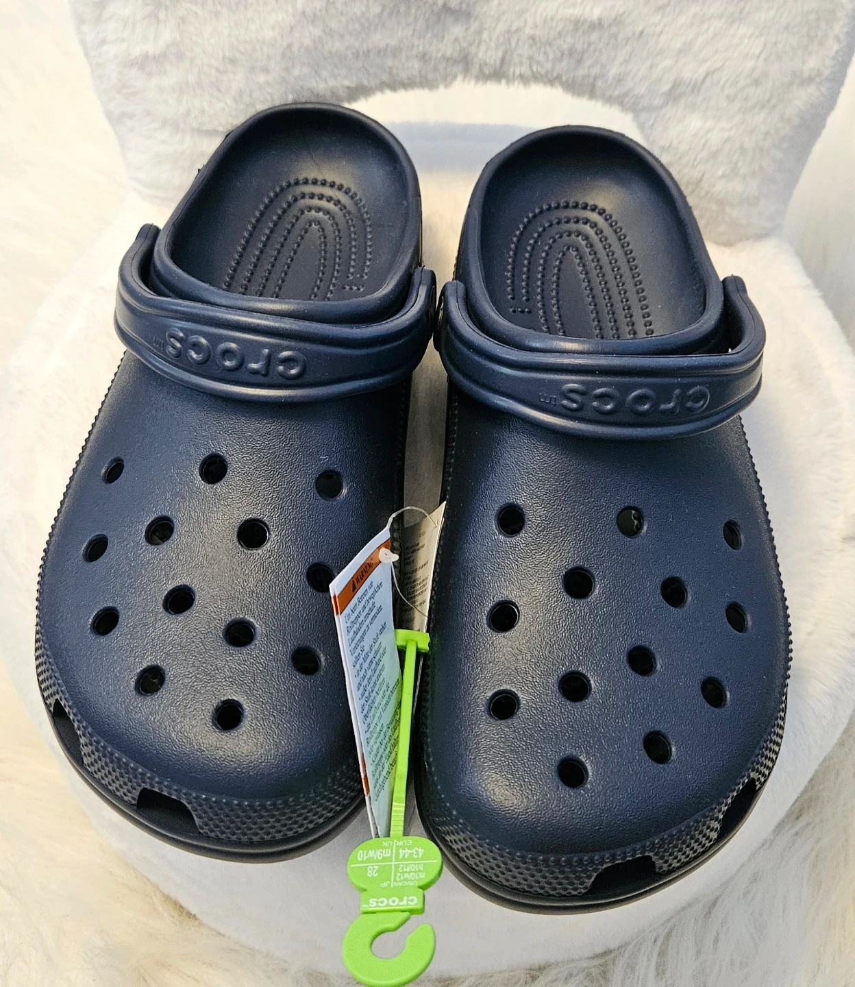 These are navy blue Crocs Classic Clogs. They're a size 10-men's / 12-women's. Made of Croslite material for lightweight cushioning.