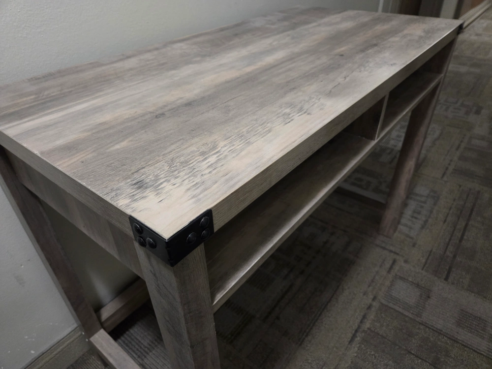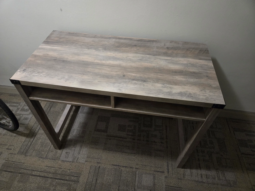 This desk is perfect for a small space and features an open shelf for storage. It has metal accents and a grey woodgrain finish. There is some minimal wear on the top. Other than that it does not have any dents or scratches.