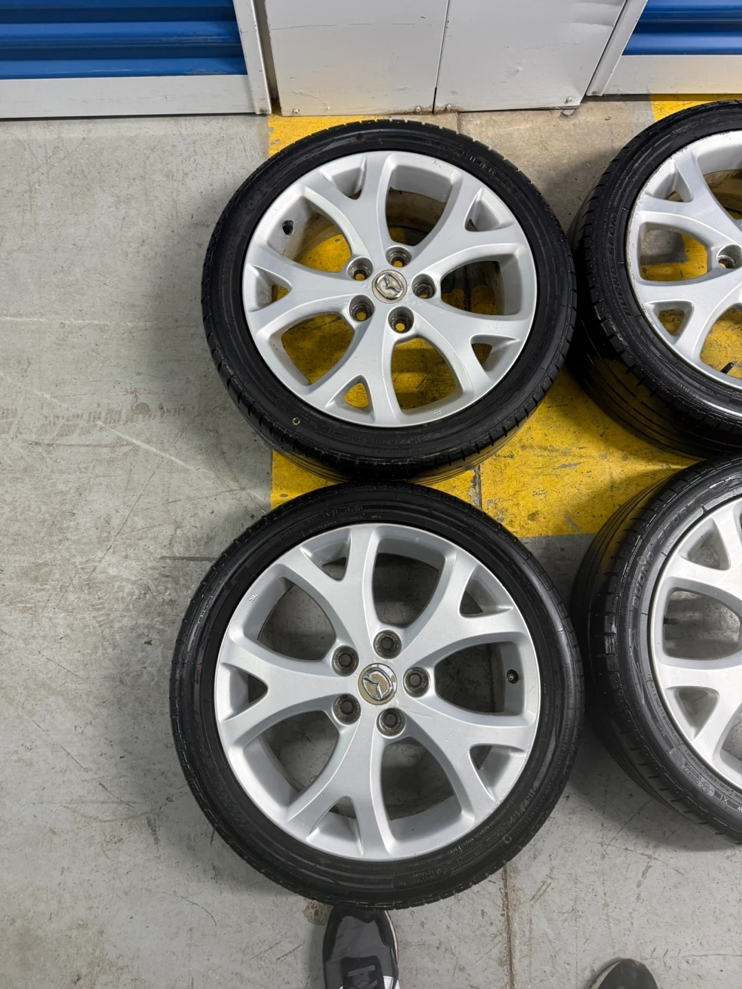 Set of 4 Mazda alloy rims with all season tires in good condition. Ready to install and use.