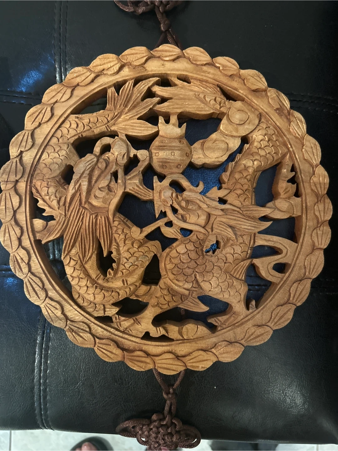 This beautiful wooden carving features two dragons with intricate details. It's a unique piece for home decoration. Hand-carved wood.