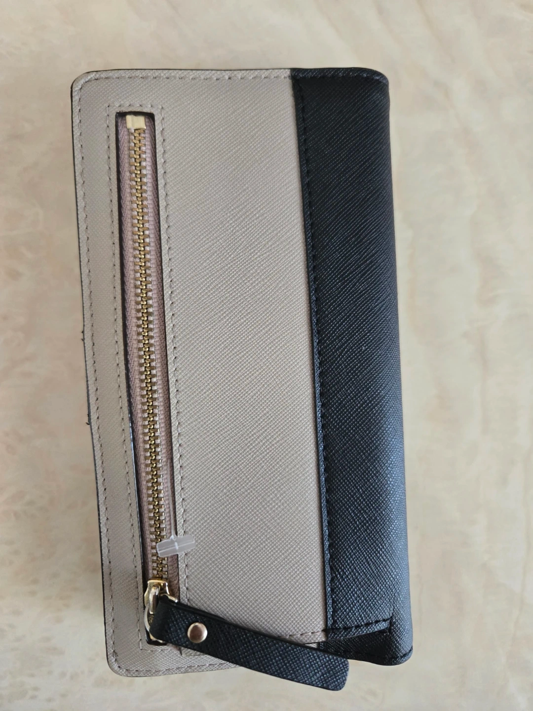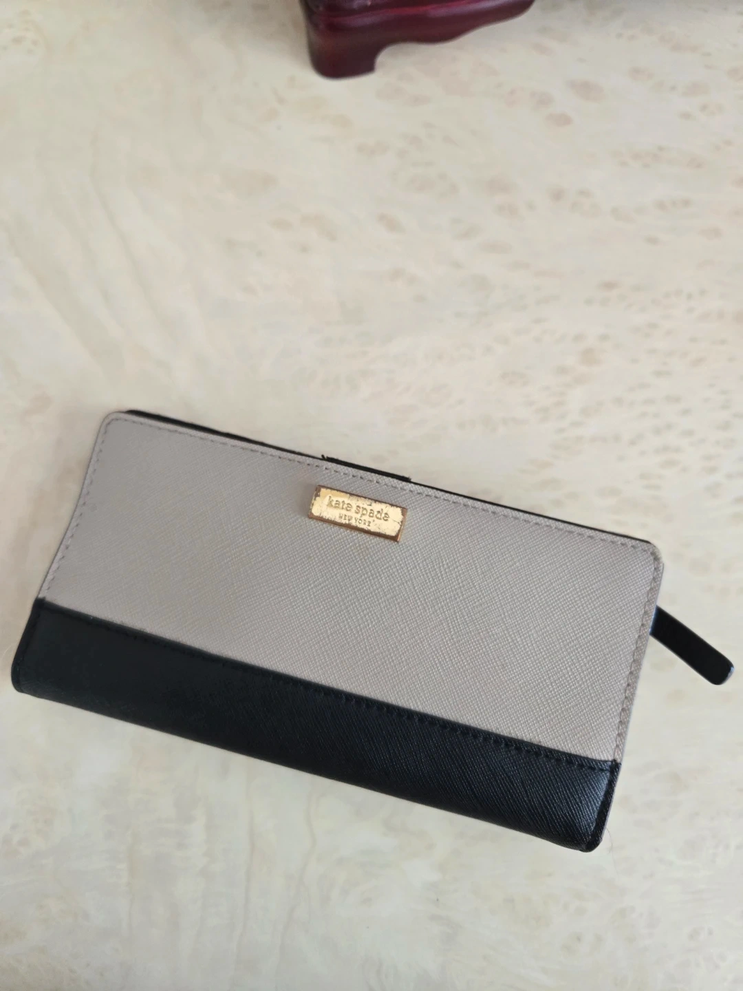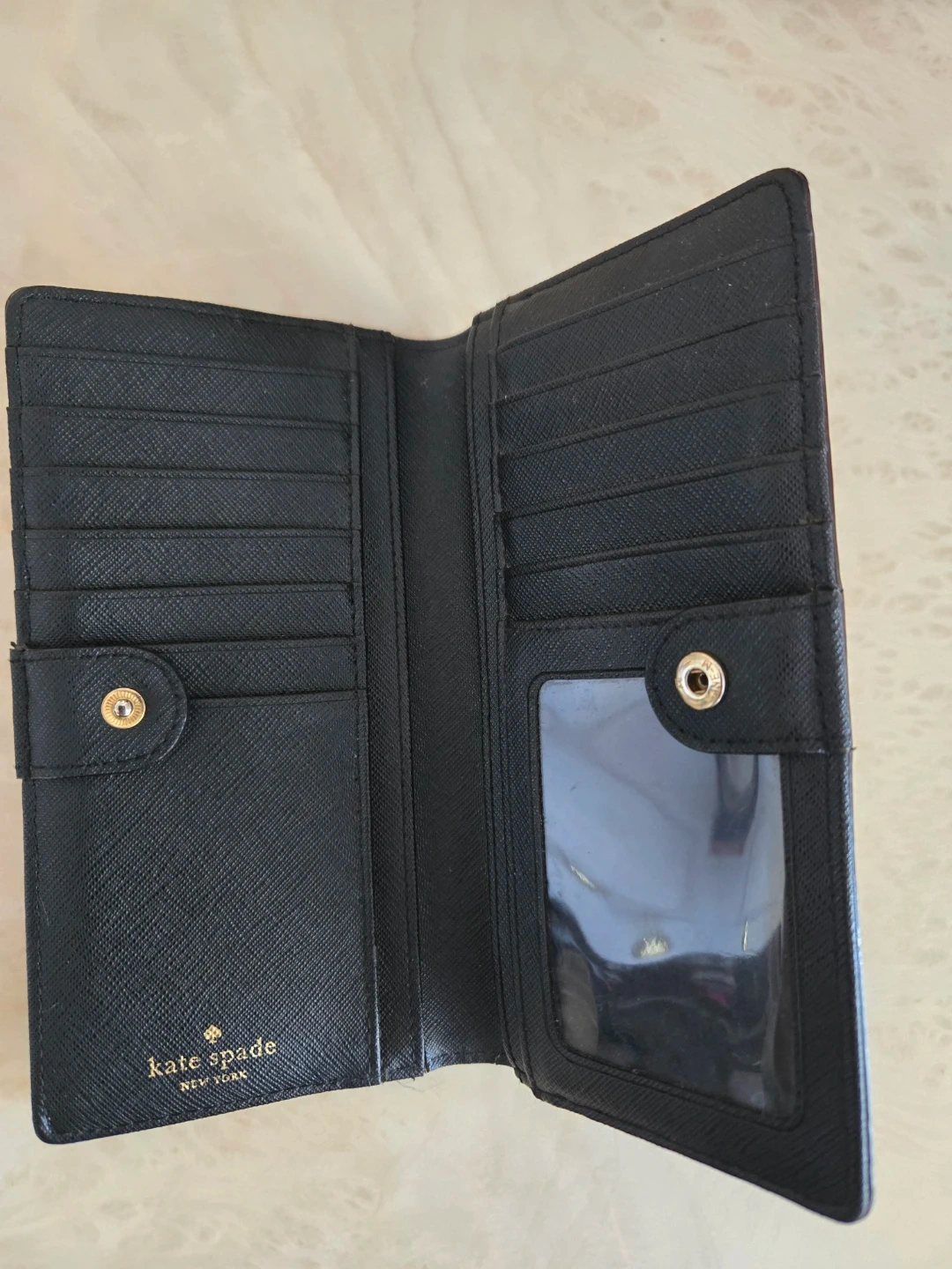 This Kate Spade wallet features a bi-fold design in a grey and black colour block. It has multiple card slots and a clear ID, the Kate spade sign is a bit worn out on the front