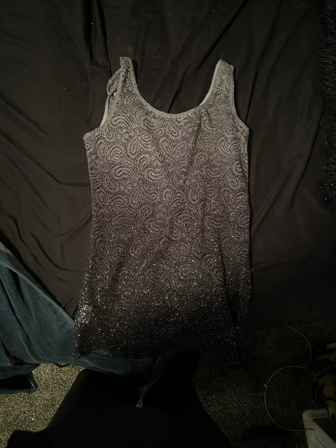 Sparkly sleeveless tanktop with a swirling pattern. Gradual glitter fade towards the hem. It's perfect for evening wear. Made with a blend of synthetic materials.