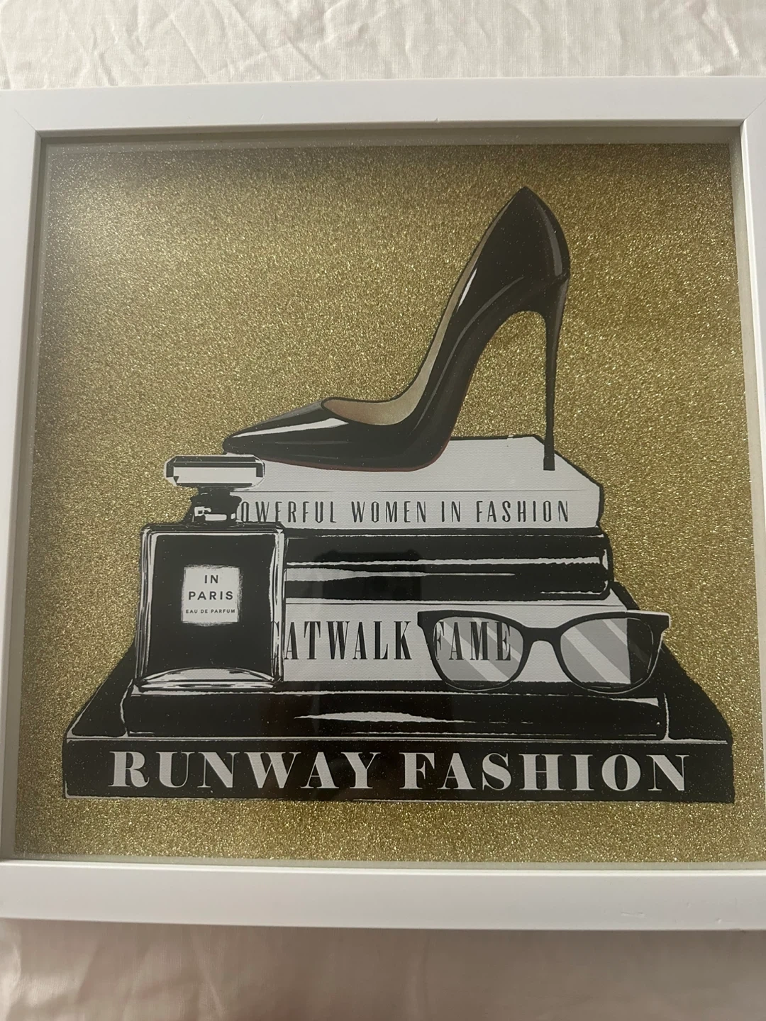 This framed art print features a glamorous fashion scene. It depicts a high heel shoe on a stack of books with "Runway Fashion" and "Powerful Women in Fashion" text. A perfume bottle and stylish glasses complete the look. It's a great piece for any fashion enthusiast's room!