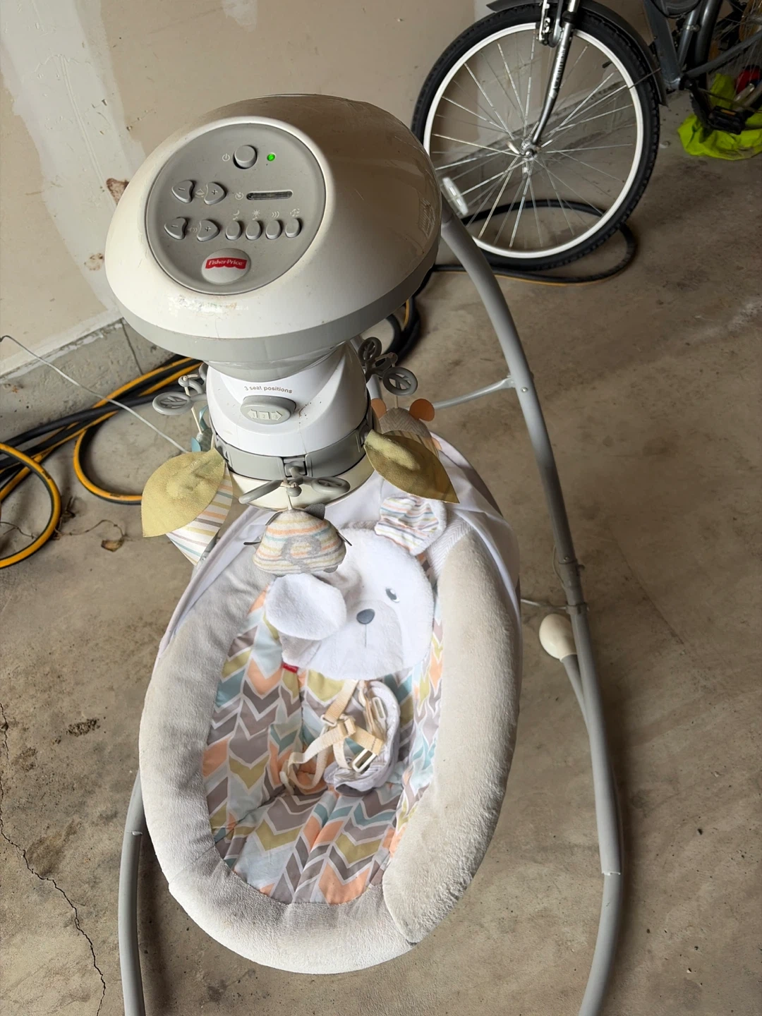 Fisher-Price baby swing with multiple seat positions and gentle motion. It's designed for soothing infants and has a soft, padded seat. Perfect for parents looking for a convenient way to comfort their baby.