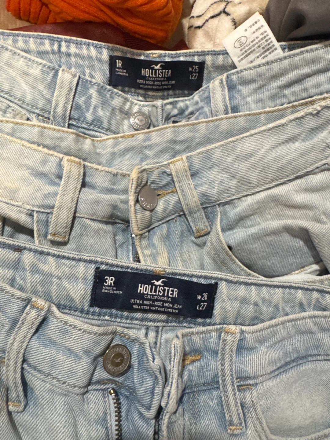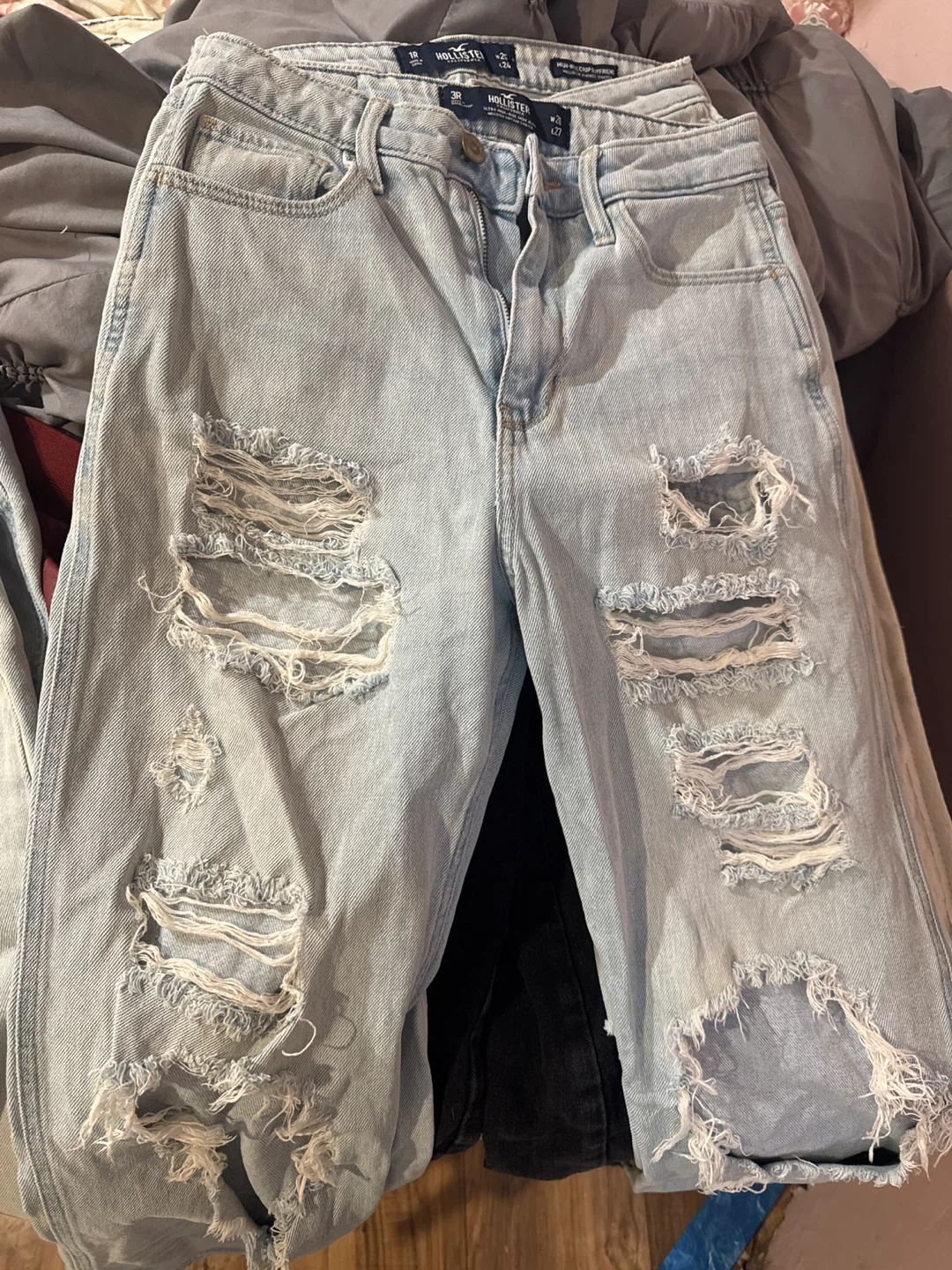 Selling Hollister Ultra High Rise Mom Jeans in size W25 L27. These light wash jeans feature a stylish distressed design. 5 each take all for 20
