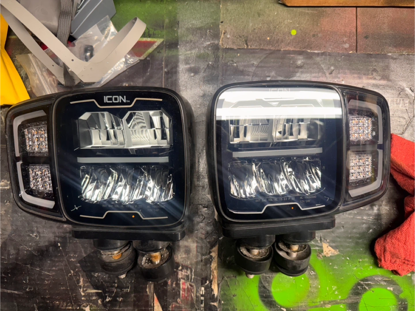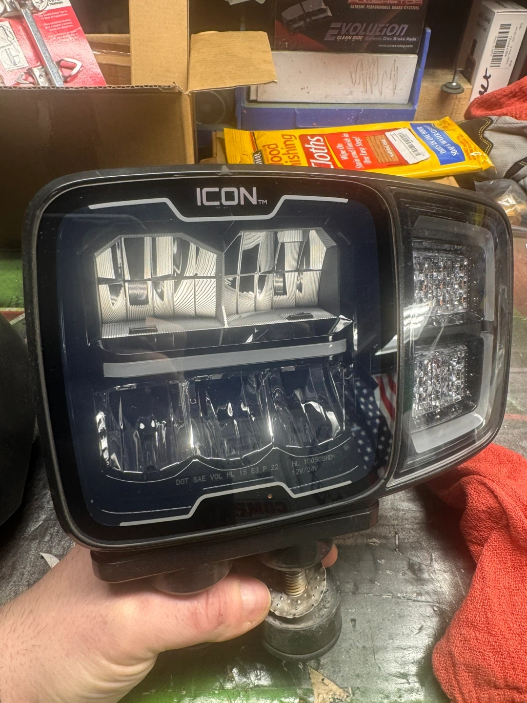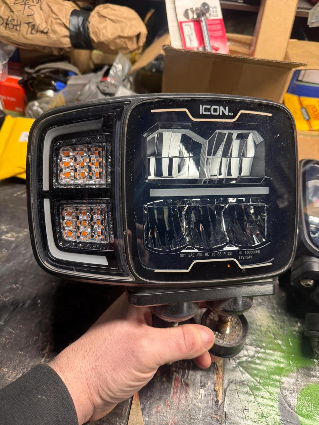 Pair of ICON LED plow lights. DOT SAE VOL HL E3 P 22. 12V/24V operation. These are high-quality plow lights for vehicles. I also have the pigtails needed to wire into your old harness’s