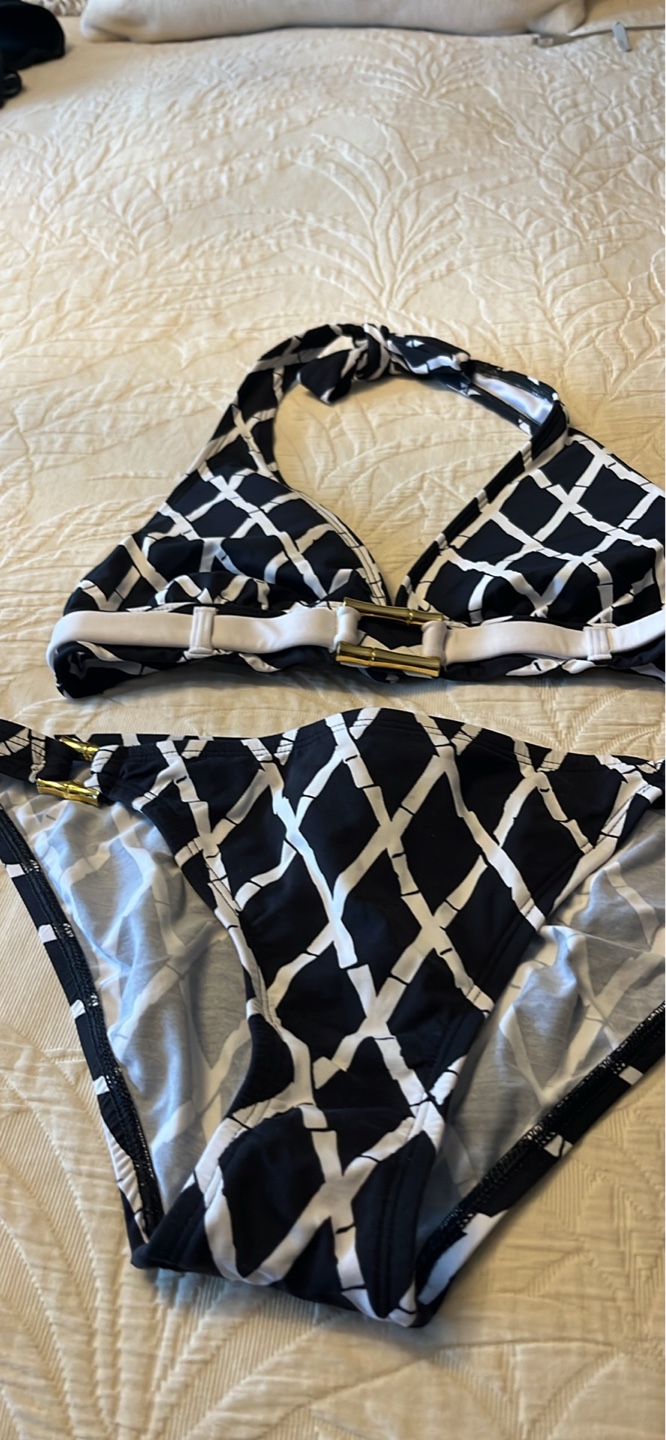 Two-piece swimsuit. Halter top and low-rise bottoms. Geometric pattern. Gold toned hardware. Size 4.