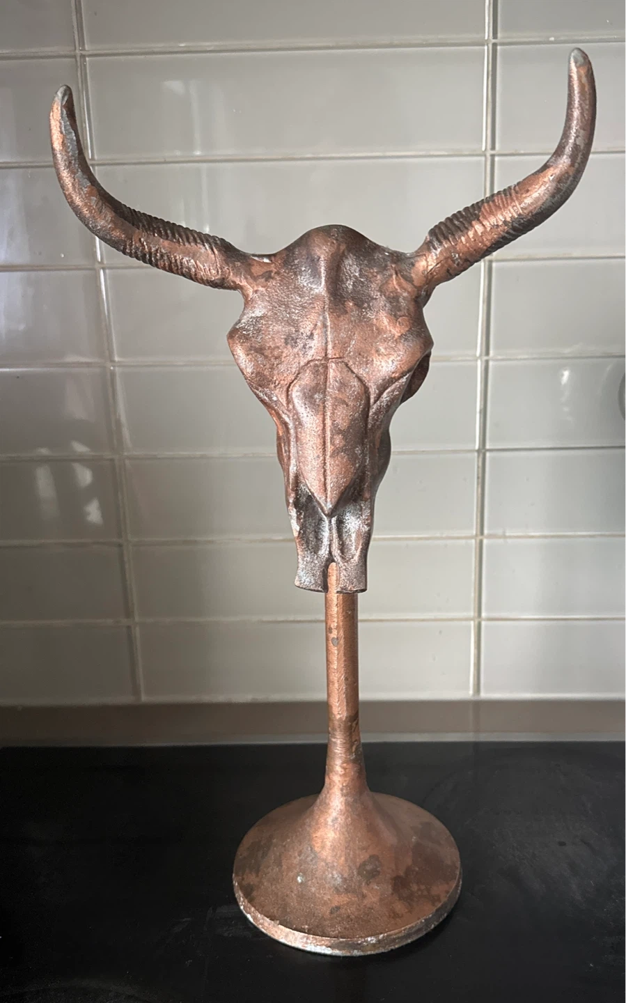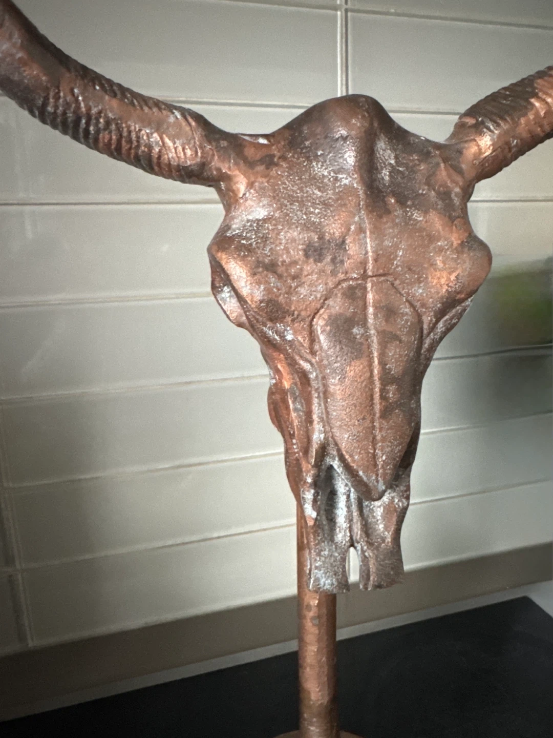 A decorative bull skull statue with a copper finish. It stands approximately 38 cm tall. This piece adds a unique, rustic touch to any space. Great for a mantelpiece or shelf! I loveee the rustic, copper colors it has.