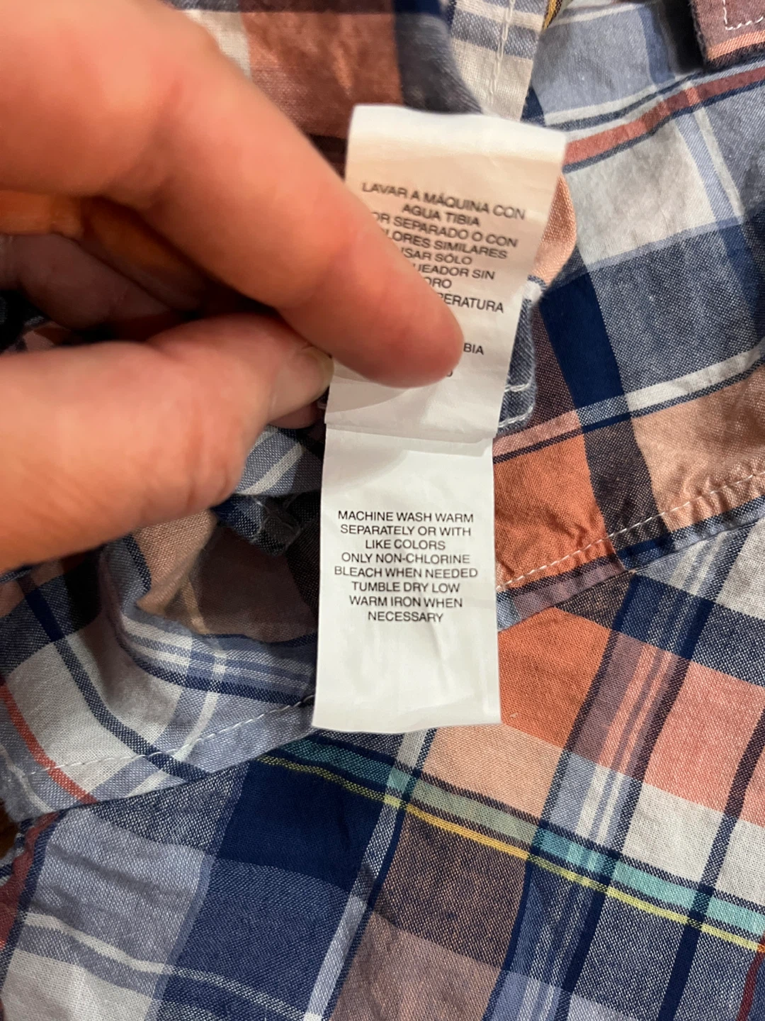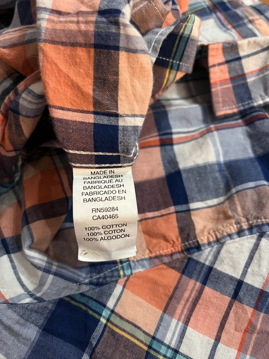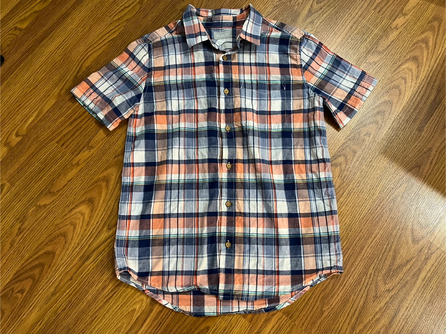 The Children’s Place boys’ short sleeve button down shirt in size sixteen. 100% cotton with a classic collar and seven-button front. Plaid colours include navy blue, peach, grey, white and teal accents. Great condition. Smoke-free home.