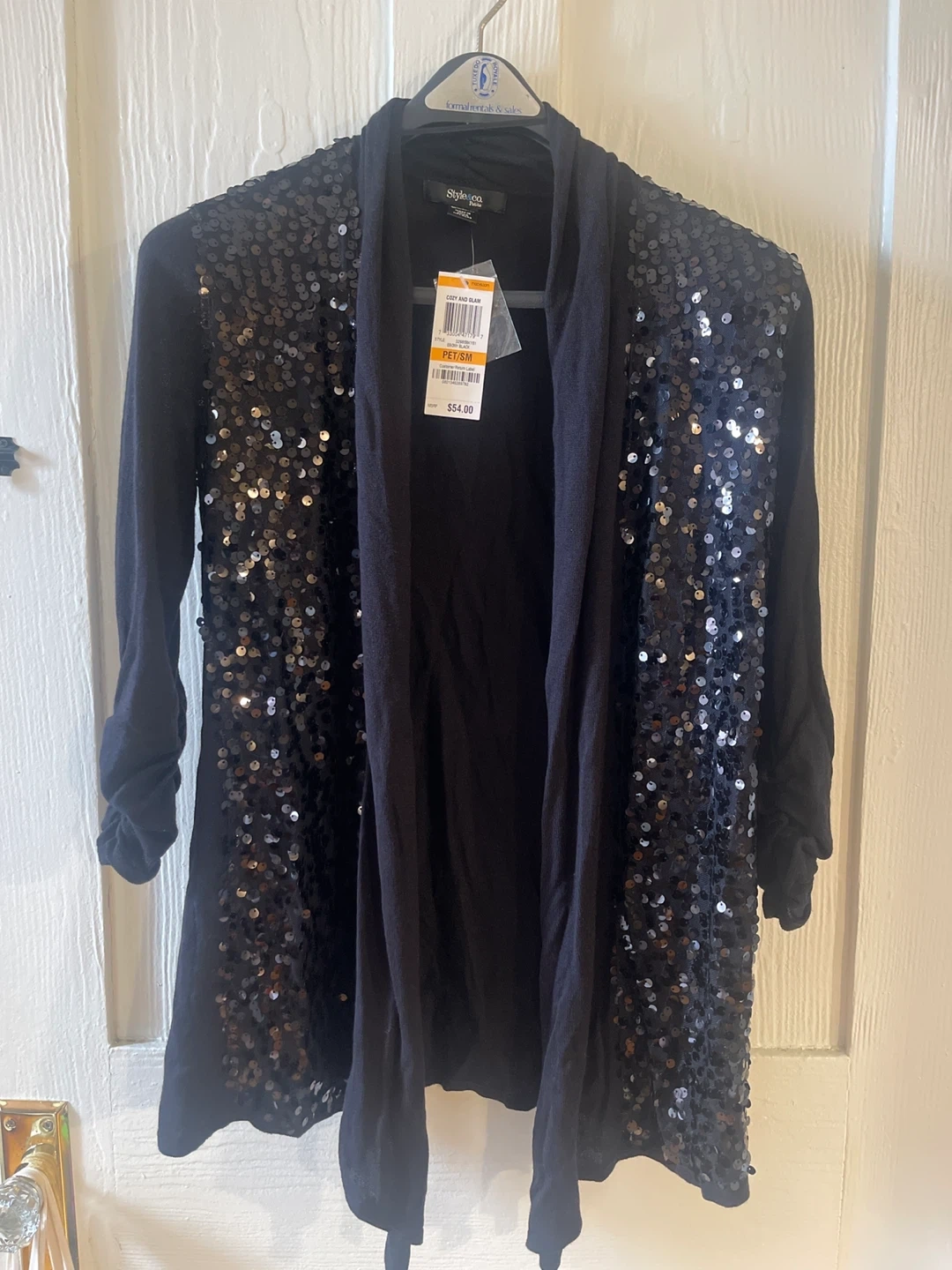 Selling a Style&co. Petite black cardigan with sequin detailing! It's a size small (PET/SM) and made of 60% cotton and 40% rayon. The original tag is still attached, and it was originally bought for $54. Perfect for adding a bit of sparkle to any outfit